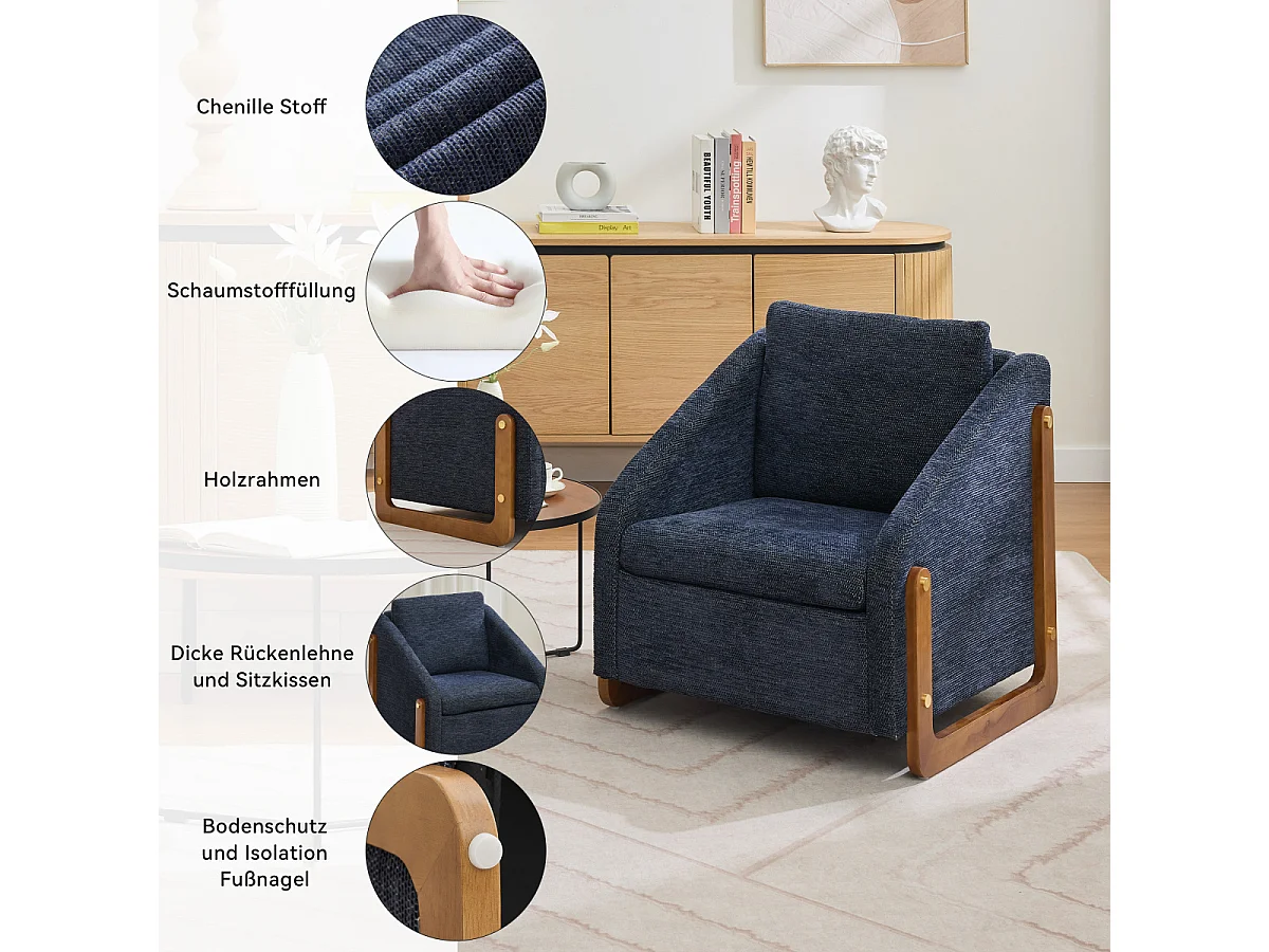 057 Poltrona, poltrona in ciniglia blu con braccioli in legno, 73,5x73,5x73,5 cm