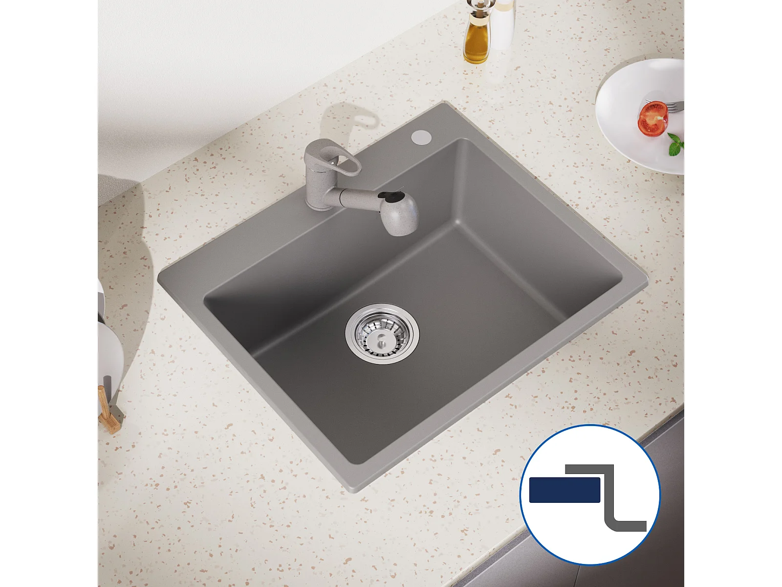 1 Vaschetta Lavello Cucina in Granito,55*45*20cm,Kit di svuotamento,Grigio+rubinetto da cucina retrattile a due funzioni, cromato
