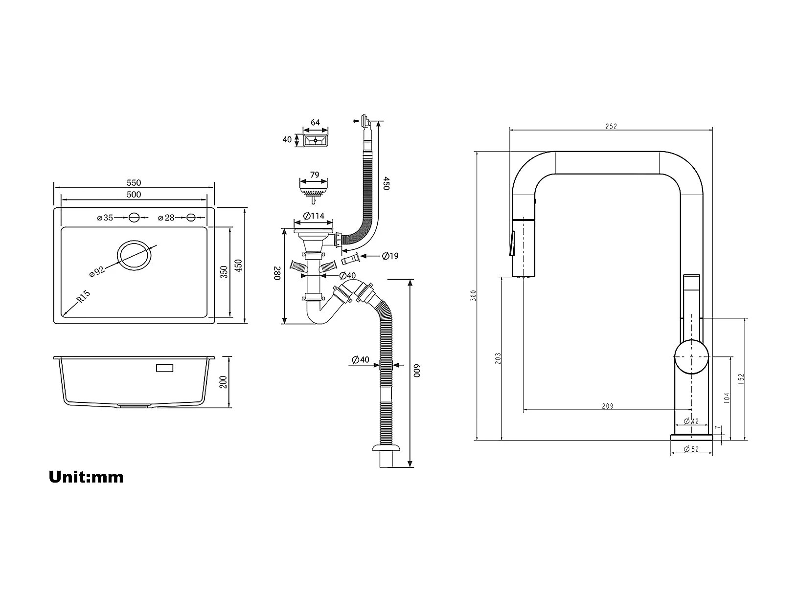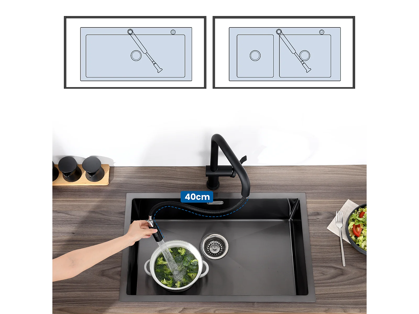 1 Vaschetta Lavello Cucina in Granito,55*45*20cm,Kit di Scarico,Grigio+Rubinetto Cucina Doccia Estraibile Due Getti Girevolanti a 360°, Nero