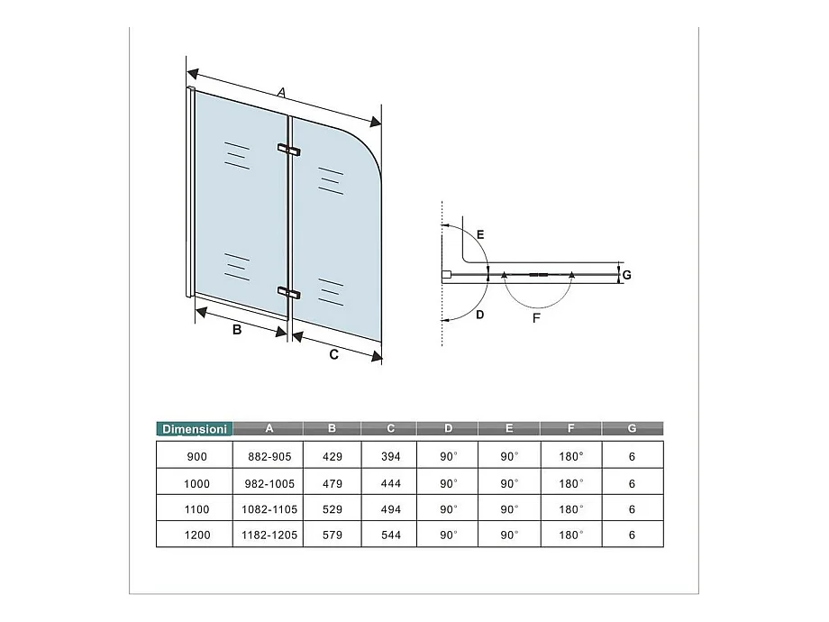 120x140 cm Parete Per Vasca Apribile 180 Gradi Montaggio Verso Destro Irreversibile in Vetro Temperato 6 mm Anticalcare Fascia Centrale Opaca