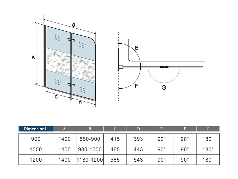 120x140 cm Parete Per Vasca Apribile 180 Gradi Montaggio Verso Destro Irreversibile in Vetro Temperato 6 mm Anticalcare Fascia Centrale Opaca