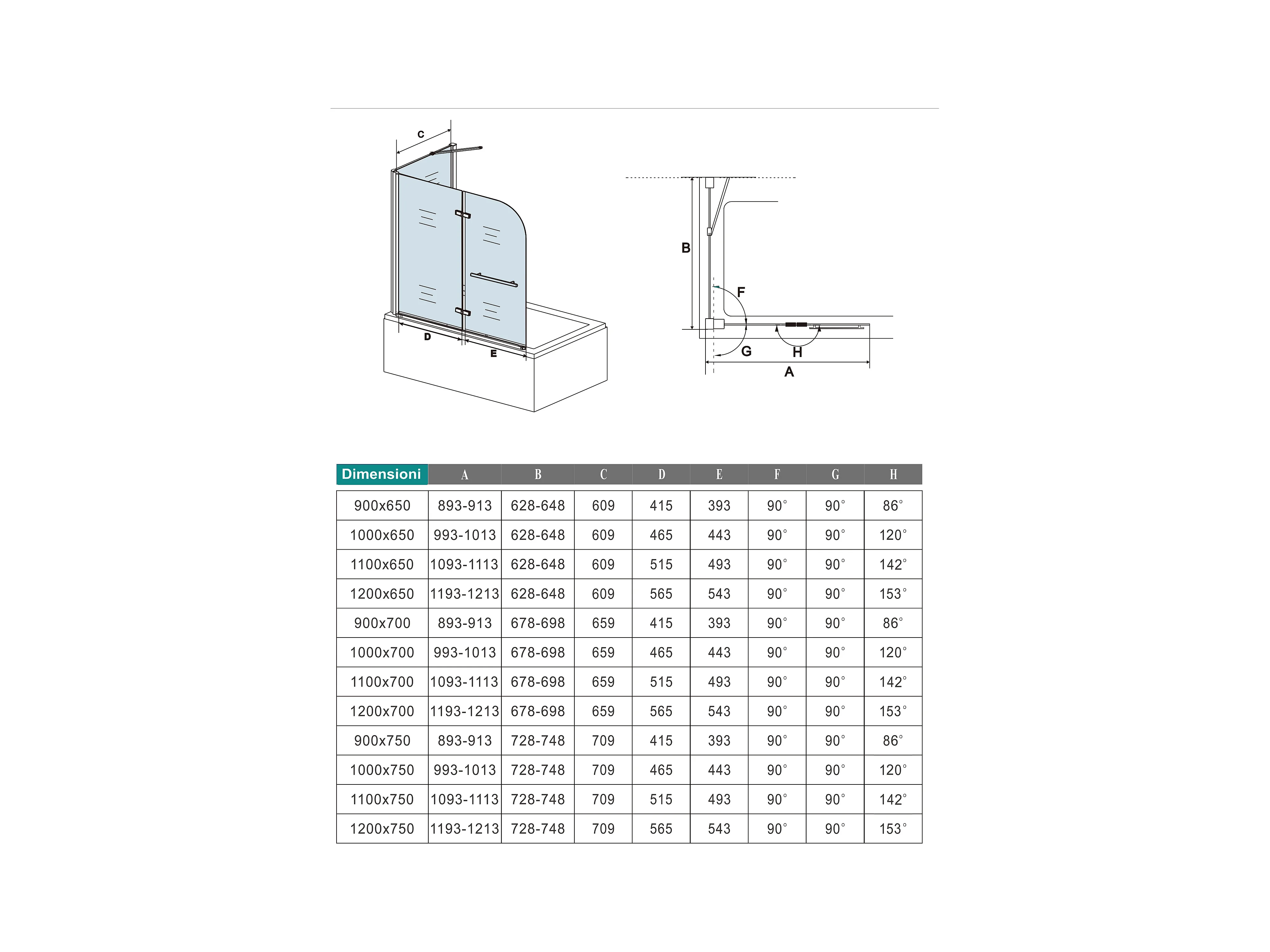 120x140 cm Parete Per Vasca Apribile 180 Gradi Montaggio Verso Destro Irreversibile in Vetro Temperato 6 mm Anticalcare Fascia Centrale Opaca