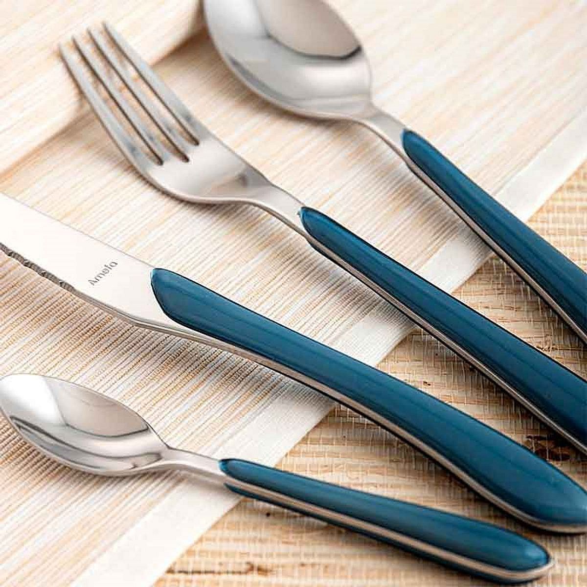 Set di posate da 24 pezzi Bistro 1-2-3 in denim blu con manici colorati in polipropilene e rivetti in acciaio inossidabile