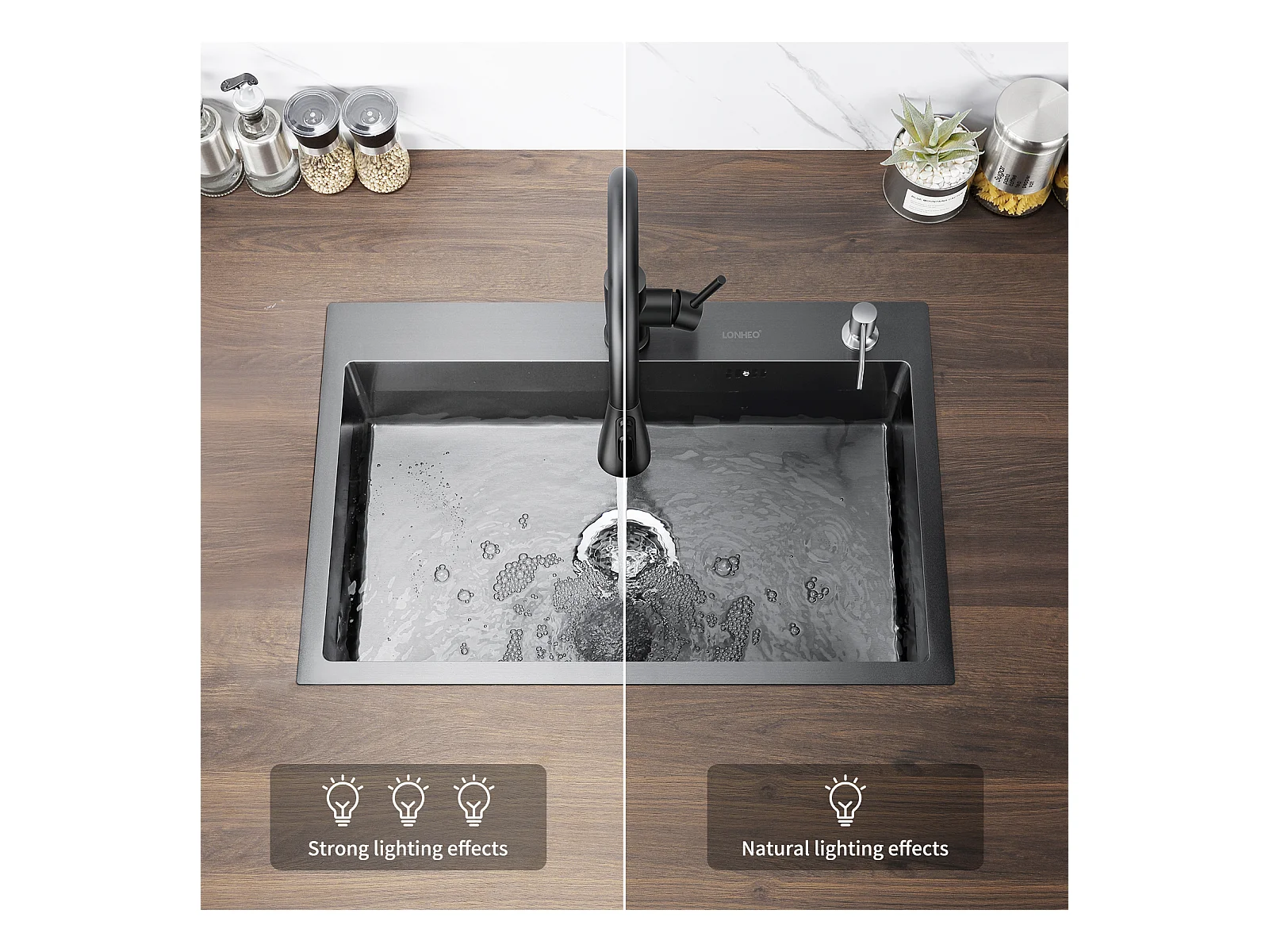 2 in 1 Lavello da Cucina Nero 68x45x19CM con Distributore di sapone e Scolapiatti cestino+Rubinetto Cucina Doccia Estraibile