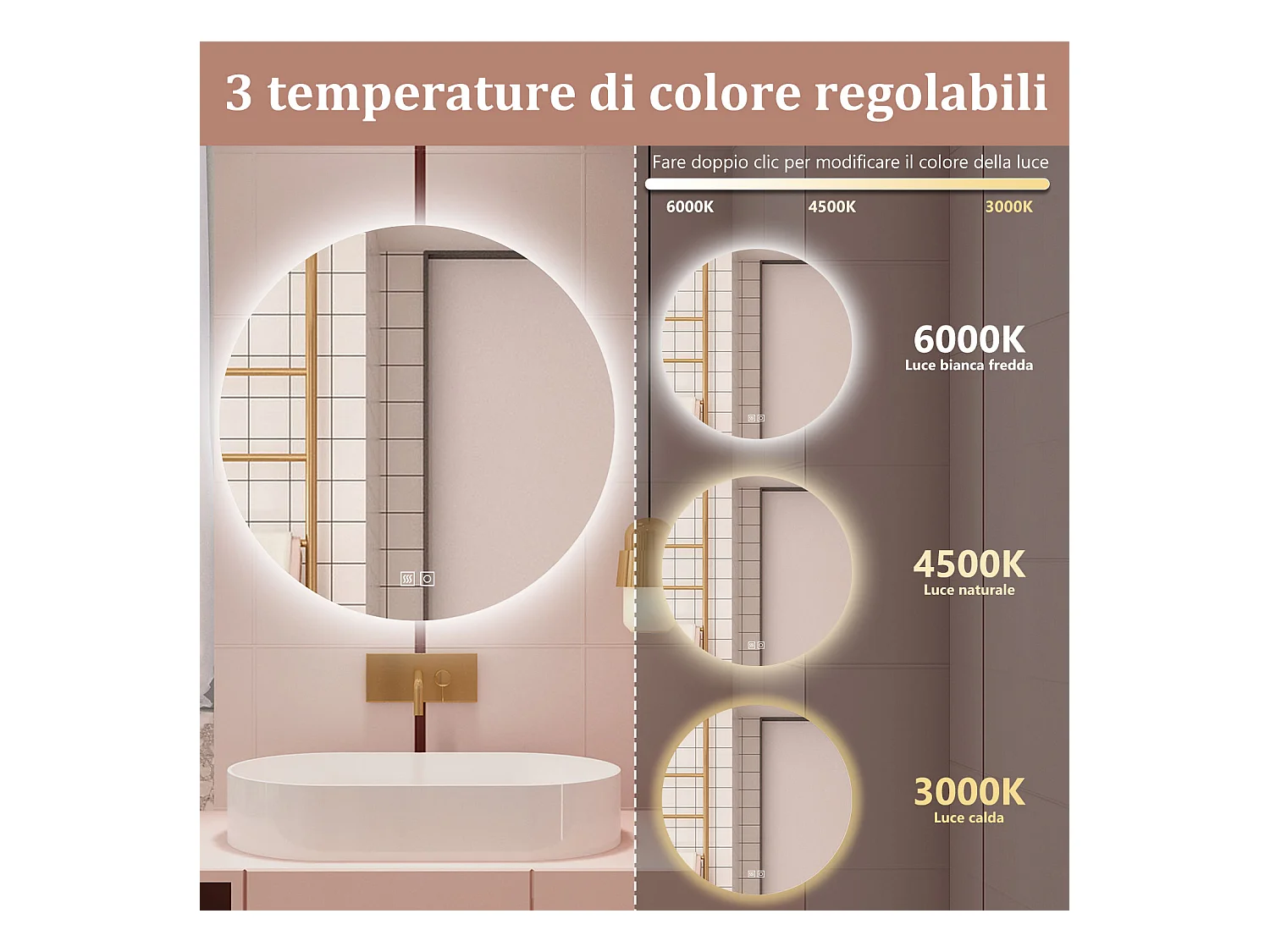 Aica Specchio da bagno a LED, Diametro 60cm, 3 Temperature di Colore, Disappannamento, Retroilluminato