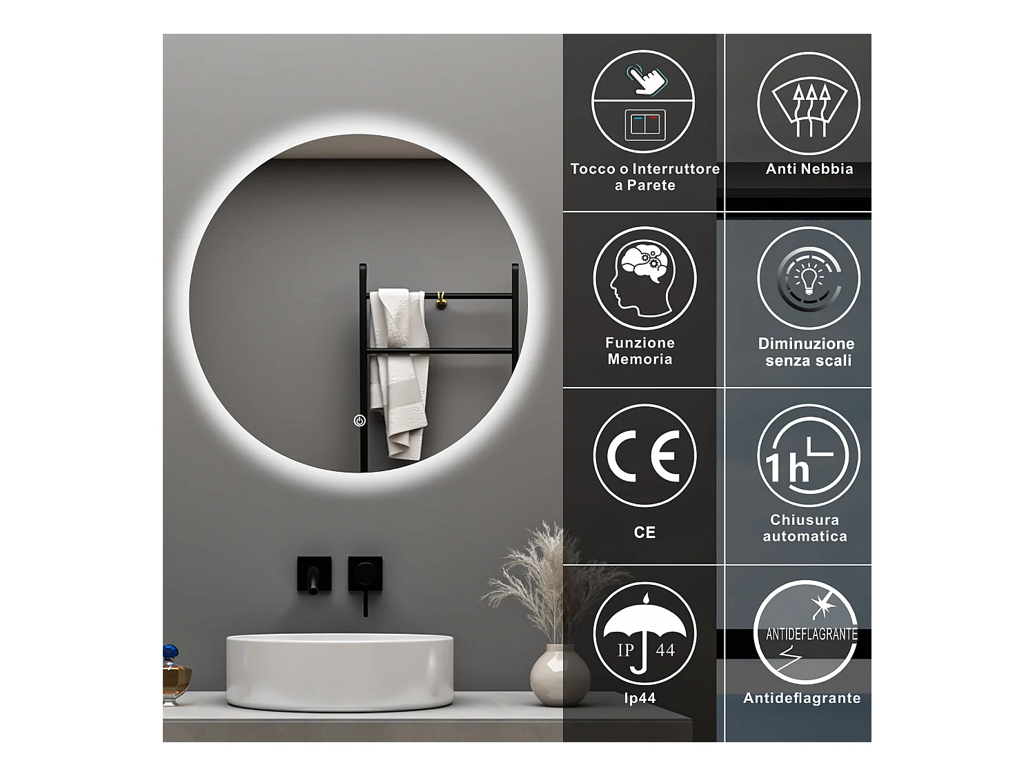 AICA Specchio da bagno rotondo con LED,Diametro 60cm,Disappannamento,Touch control,Retroilluminato,Funzione Memoria