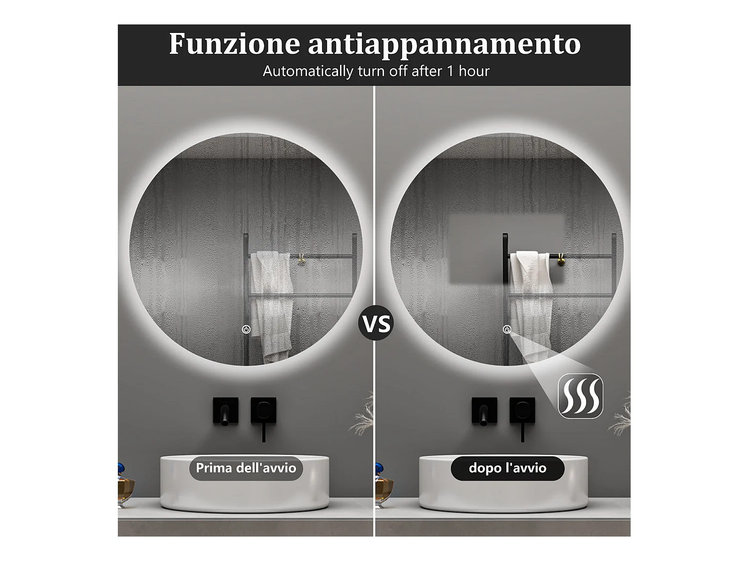 Aica Specchio da bagno a LED, Diametro 60cm, 3 Temperature di Colore, Disappannamento, Retroilluminato