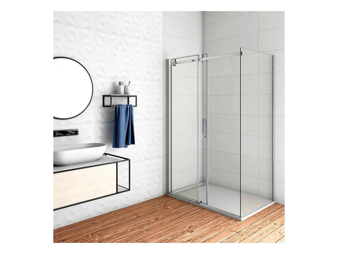 Aica Italy 130x70cm H.195 cm Box Doccia Angolare Porta Scorrevole Con Parete Laterale Vetro 8 Mm Temperato Anticalcare Trasparente Cromato Lucido