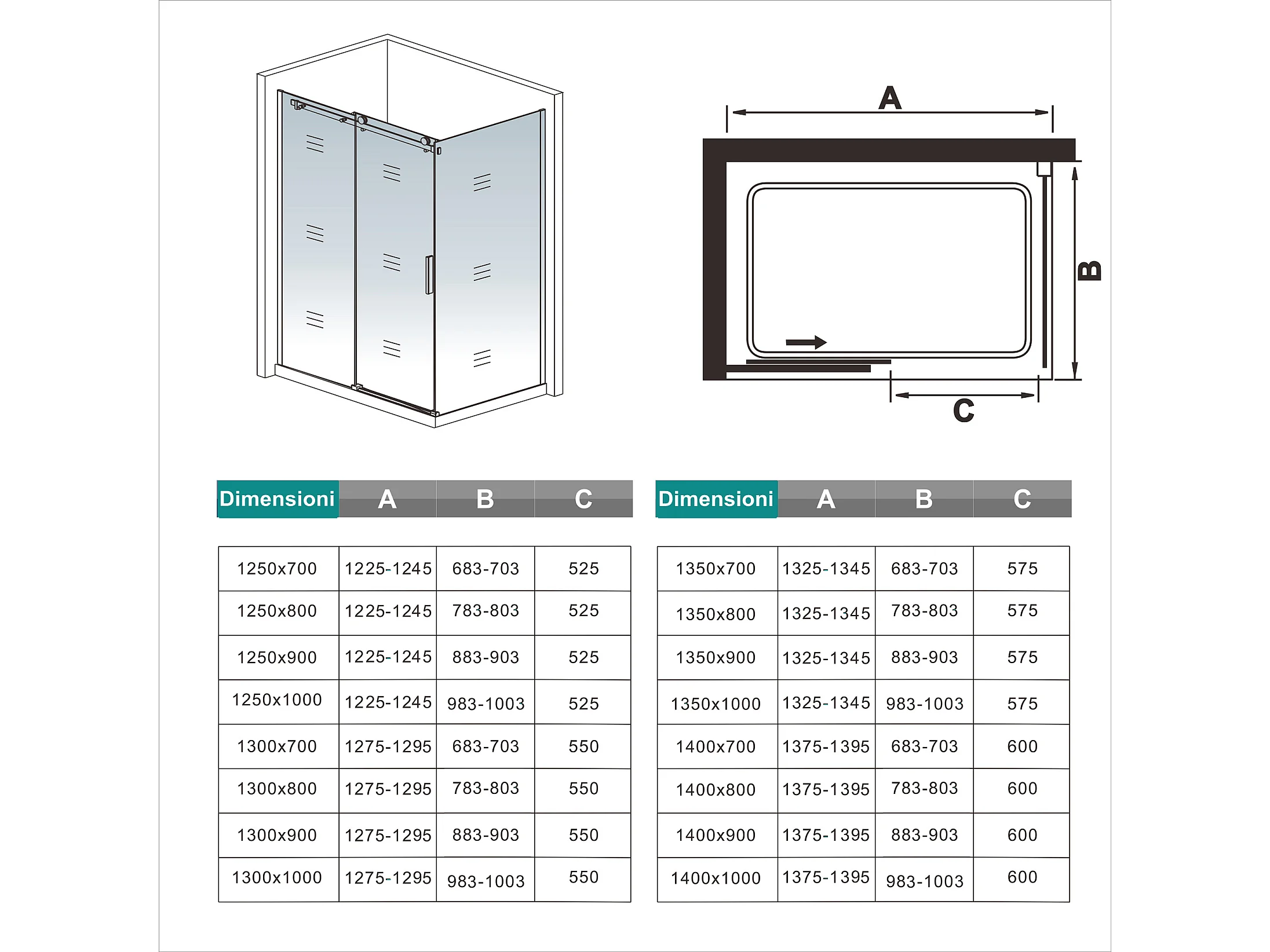 Aica Italy 140x90cm H.195 cm Box Doccia Angolare Porta Scorrevole Con Parete Laterale Vetro 8 Mm Temperato Anticalcare Trasparente Cromato Lucido