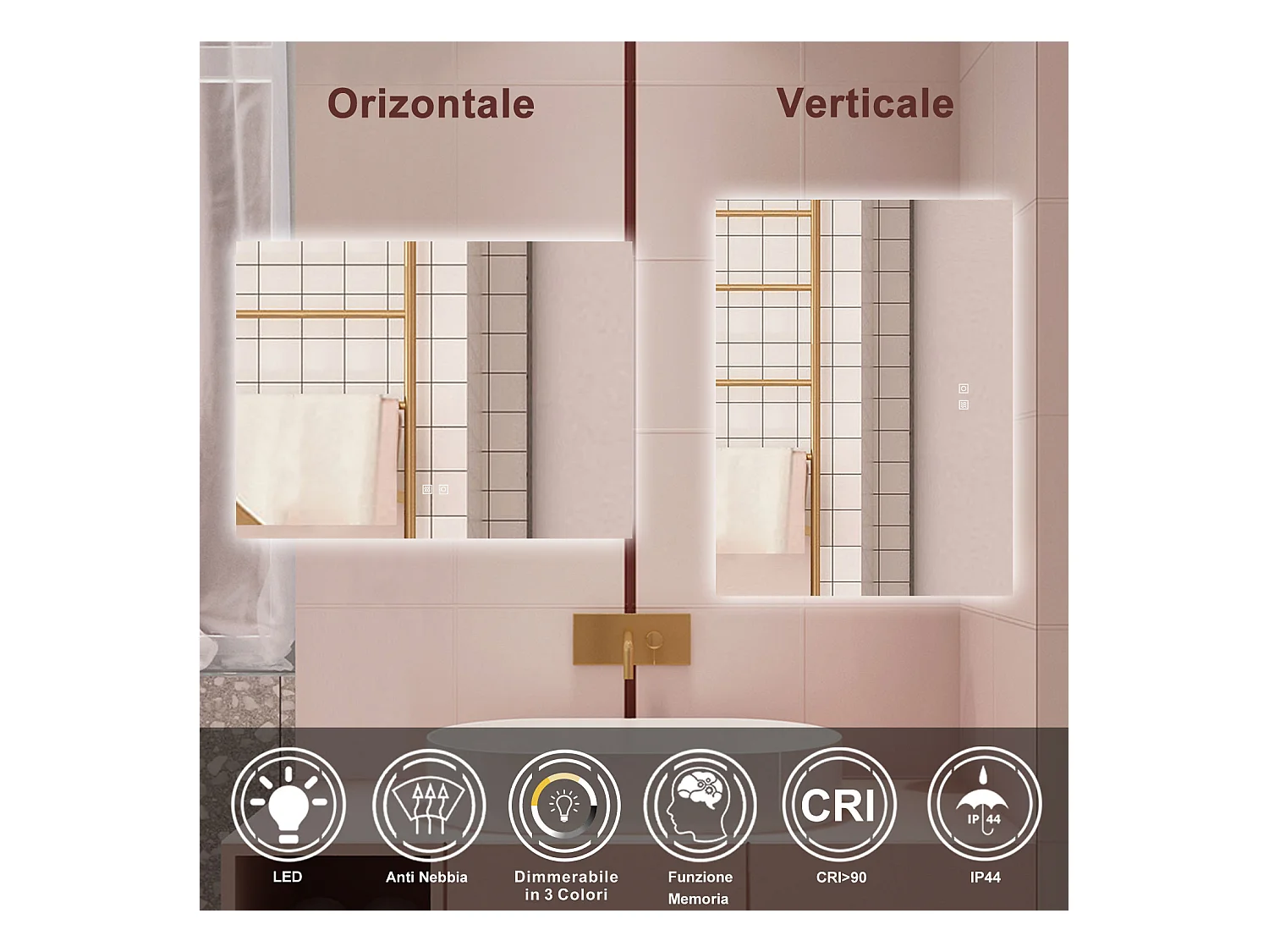 AICA Specchio da bagno 100 x 60 cm, dimmerabile, Funzione Memoria, antiappannamento, 3 colori