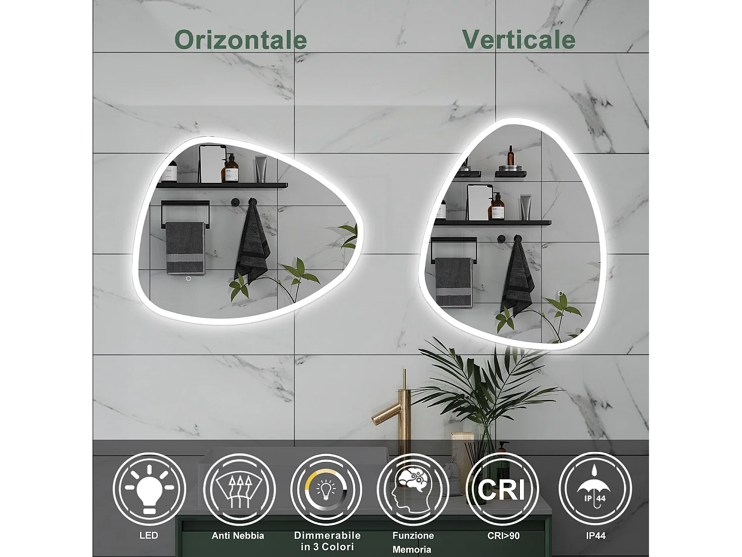 AICA Specchio da bagno 100 x 80 cm, dimmerabile, Funzione Memoria, antiappannamento, 3 colori