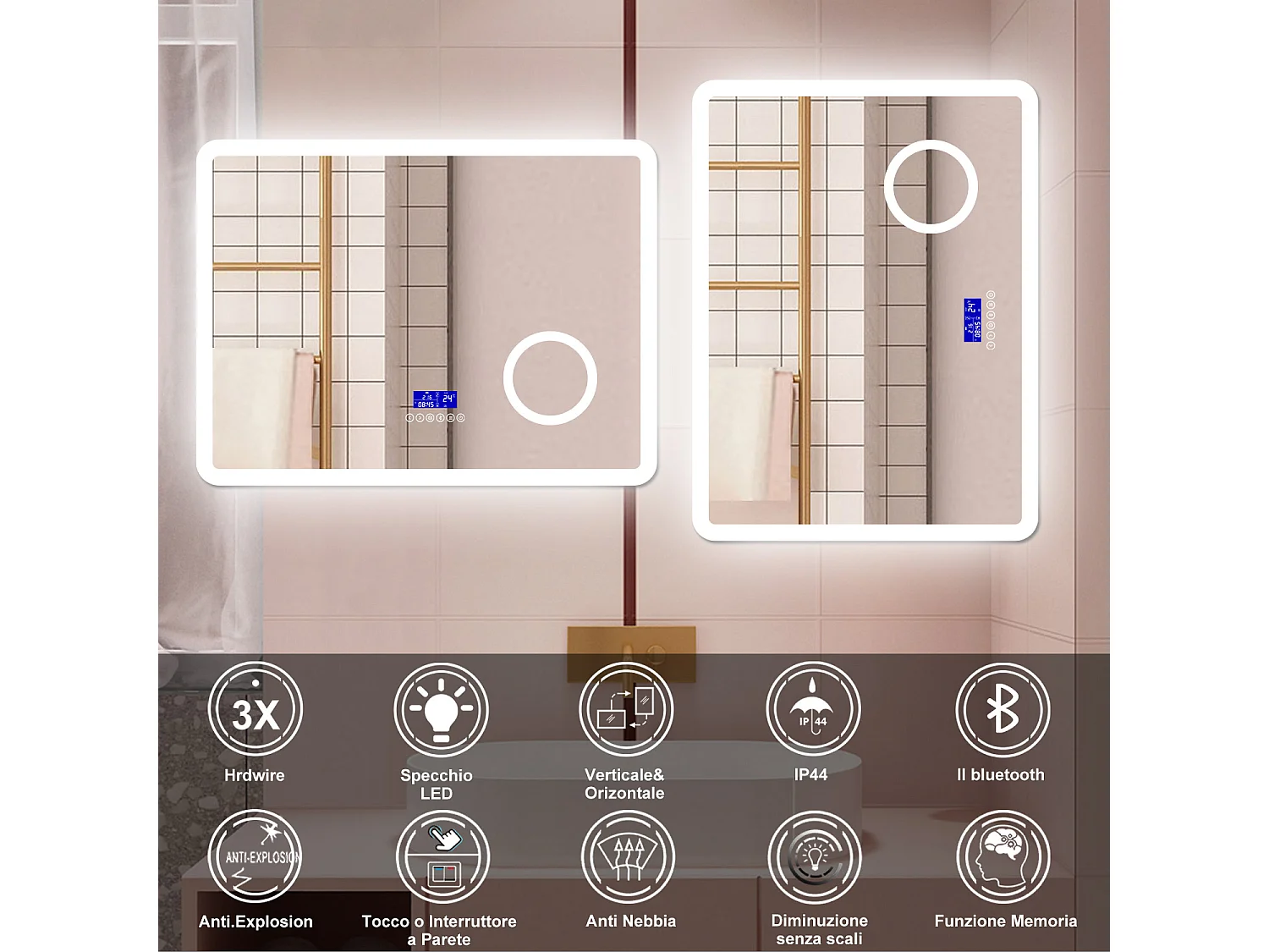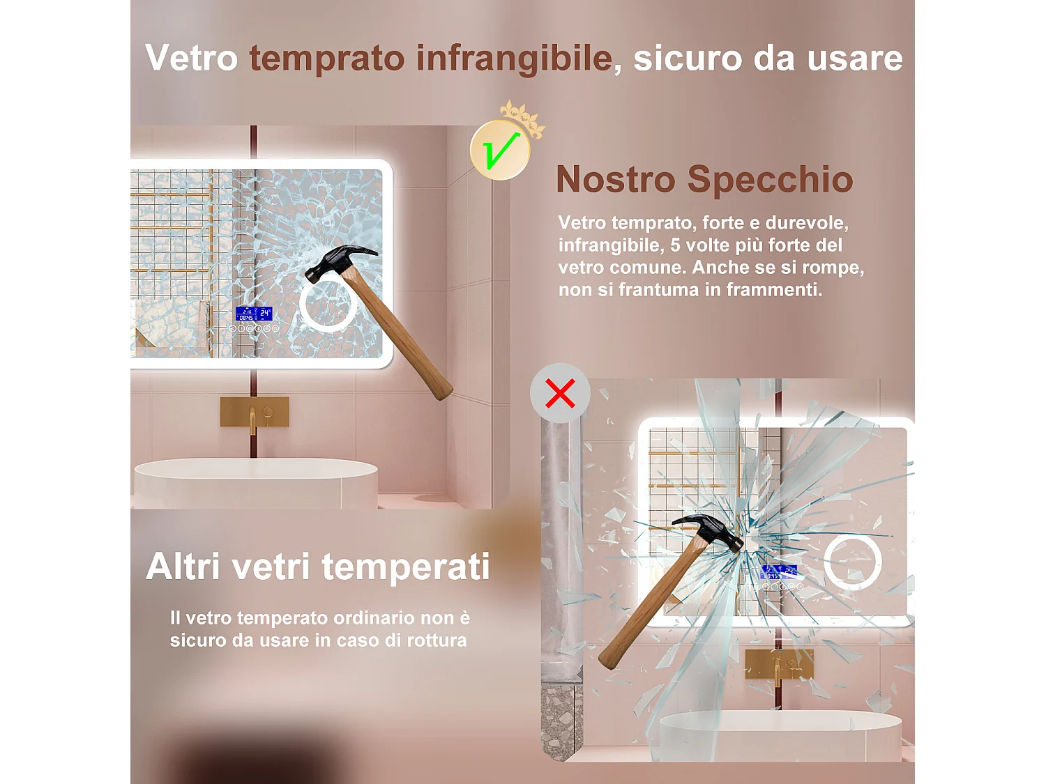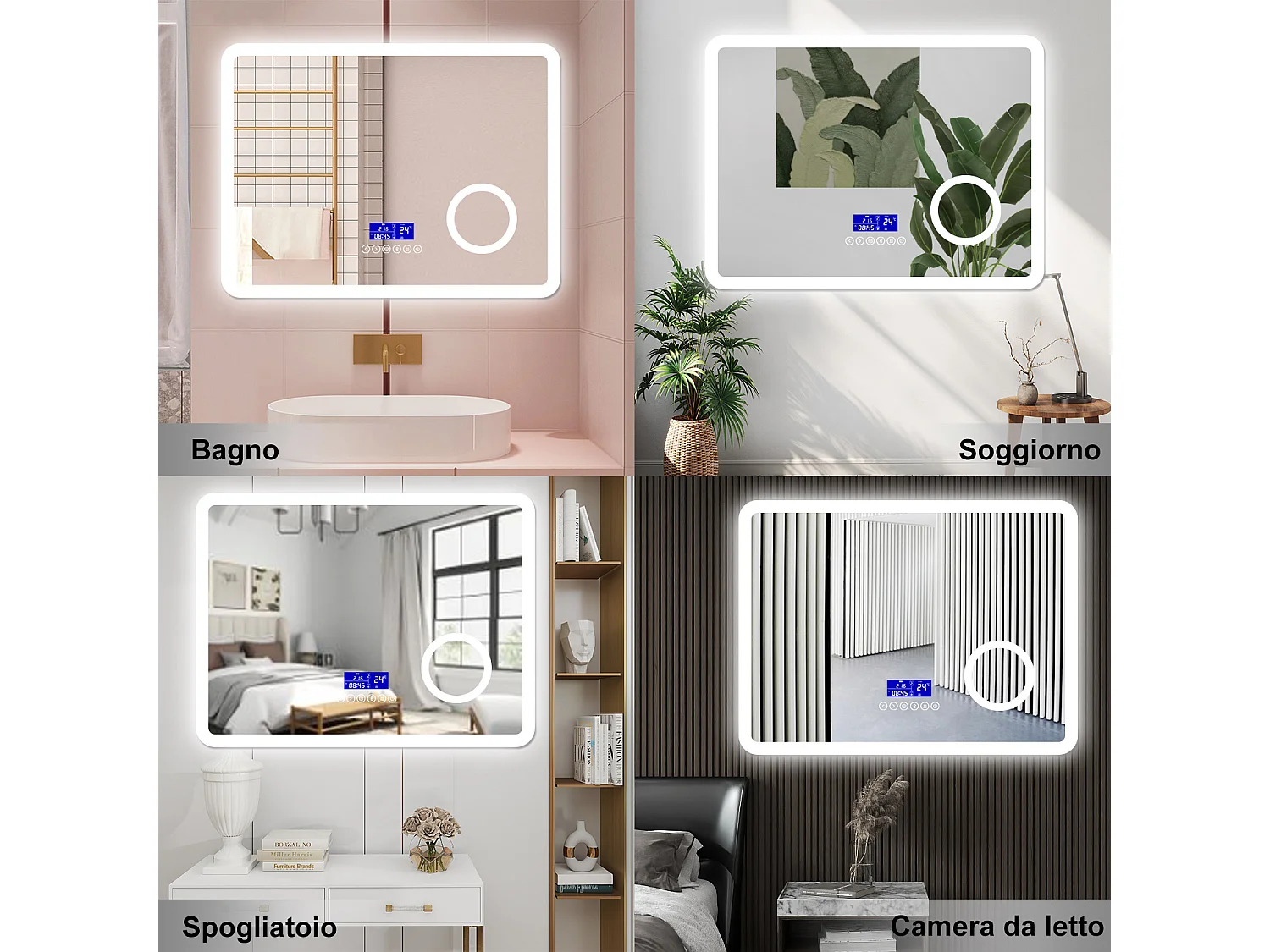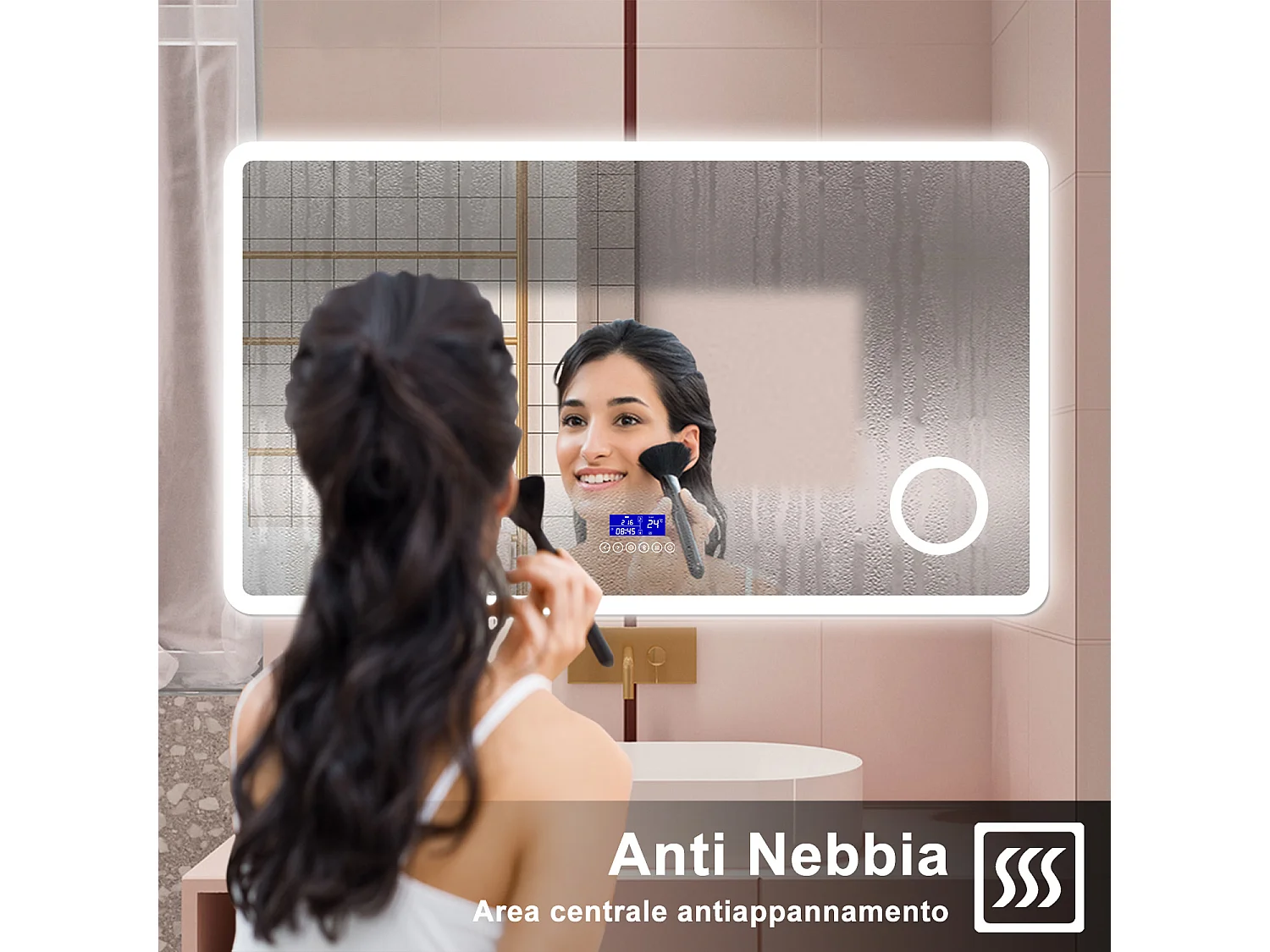 AICA Specchio da bagno 120 x 70 cm, dimmerabile, Blue tooth, Funzione Memoria, antiappannamento, 3 colori, Magnificatore