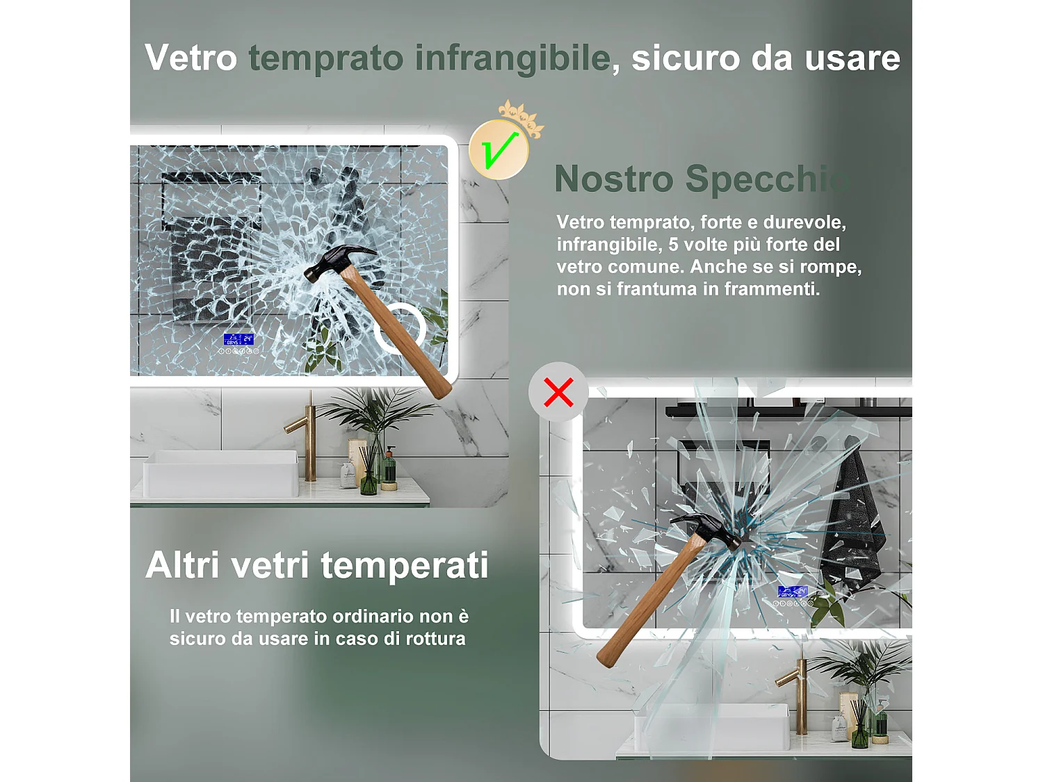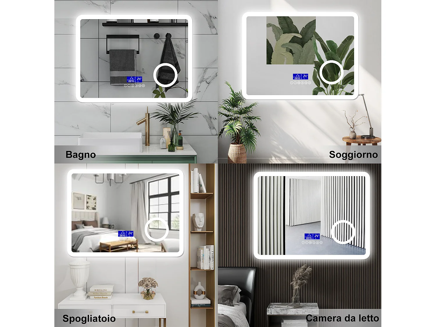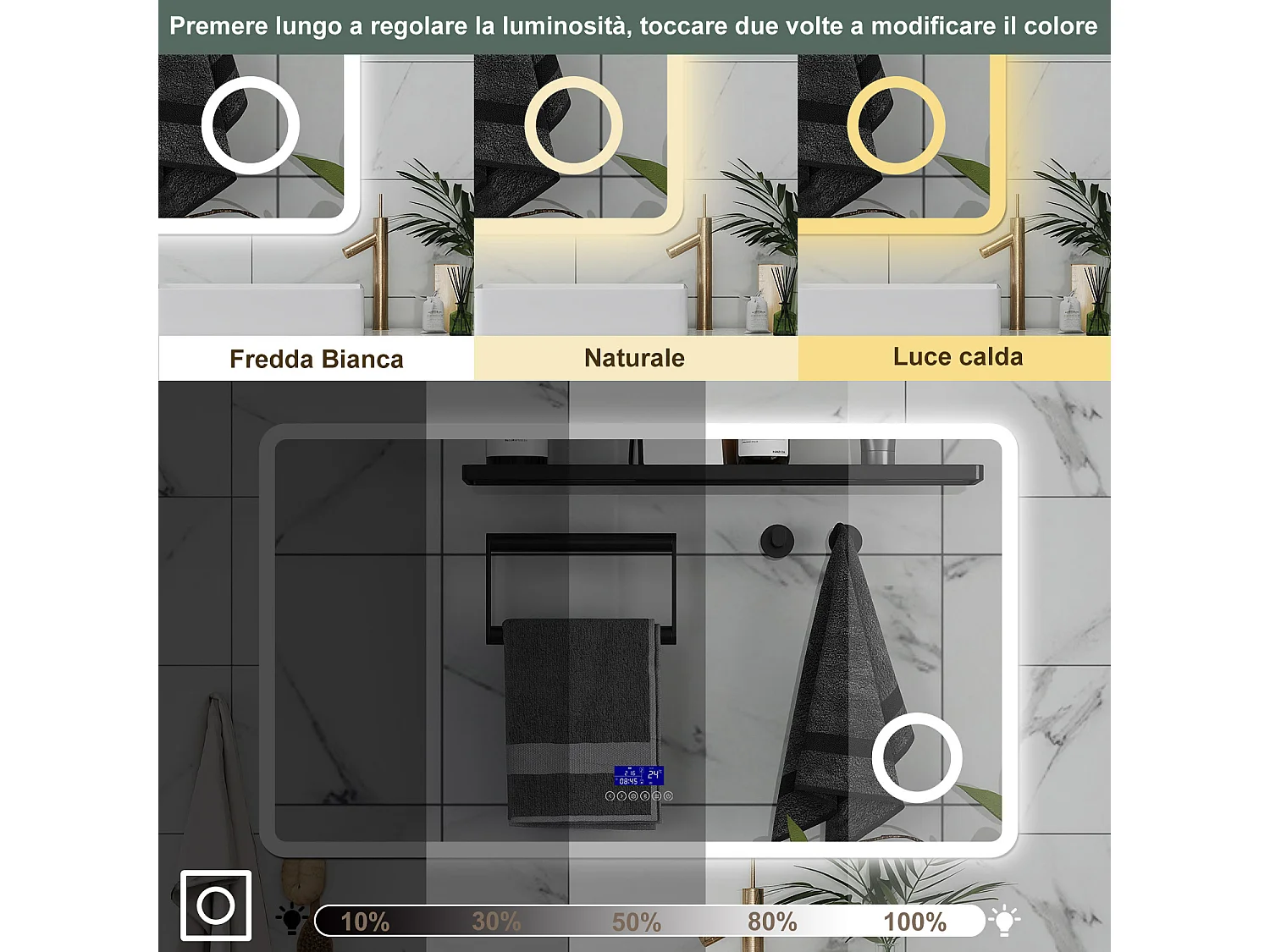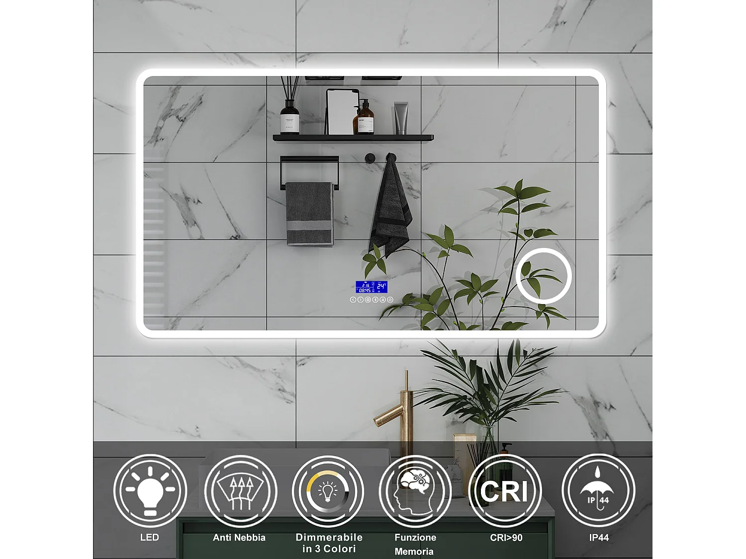 Specchio da bagno Rettangolare con 120x70cm,Blue tooth,3 colori,Memoria, Antifog,Regorabile,Retroilluminato,doppio interruttore,