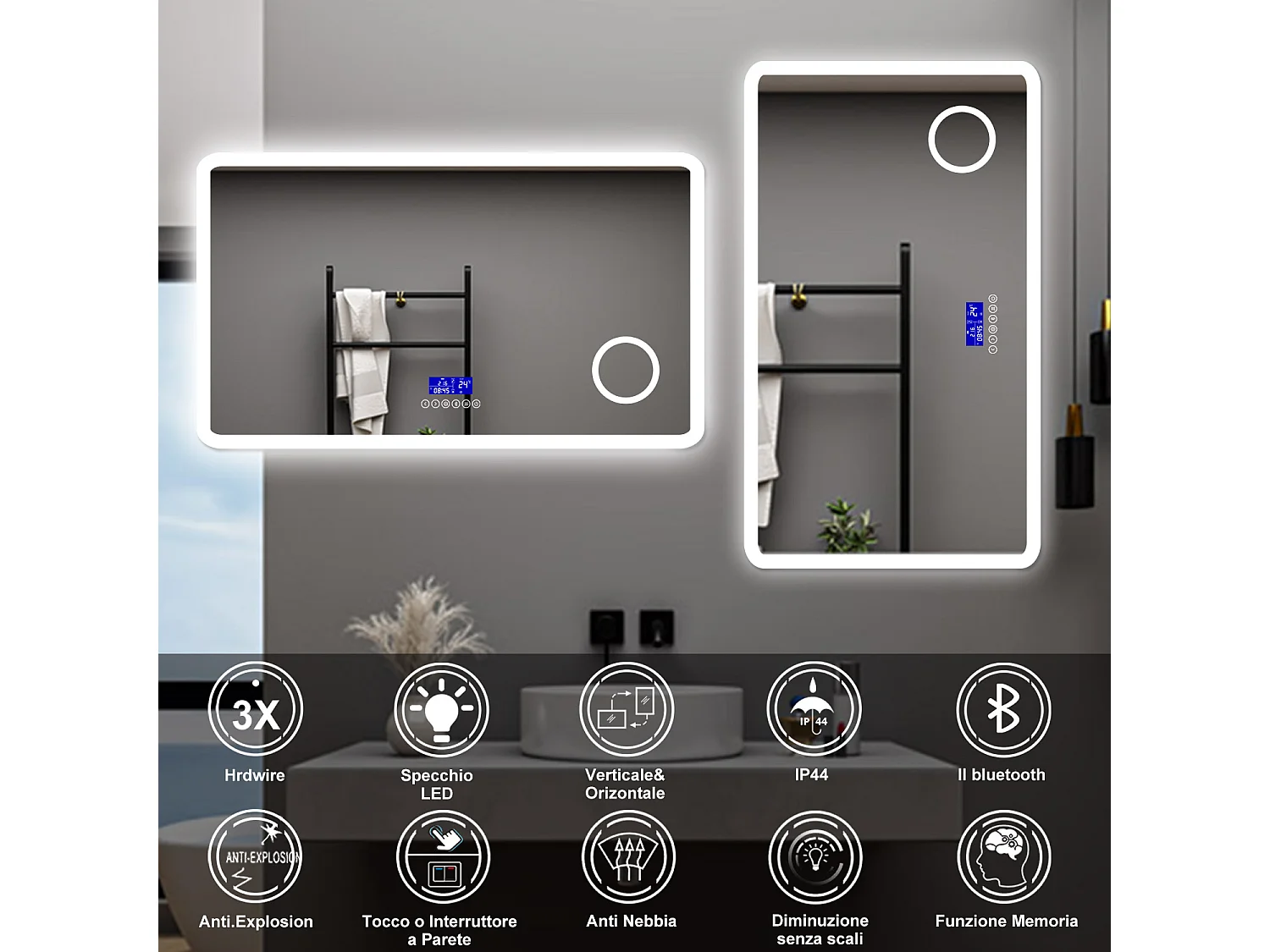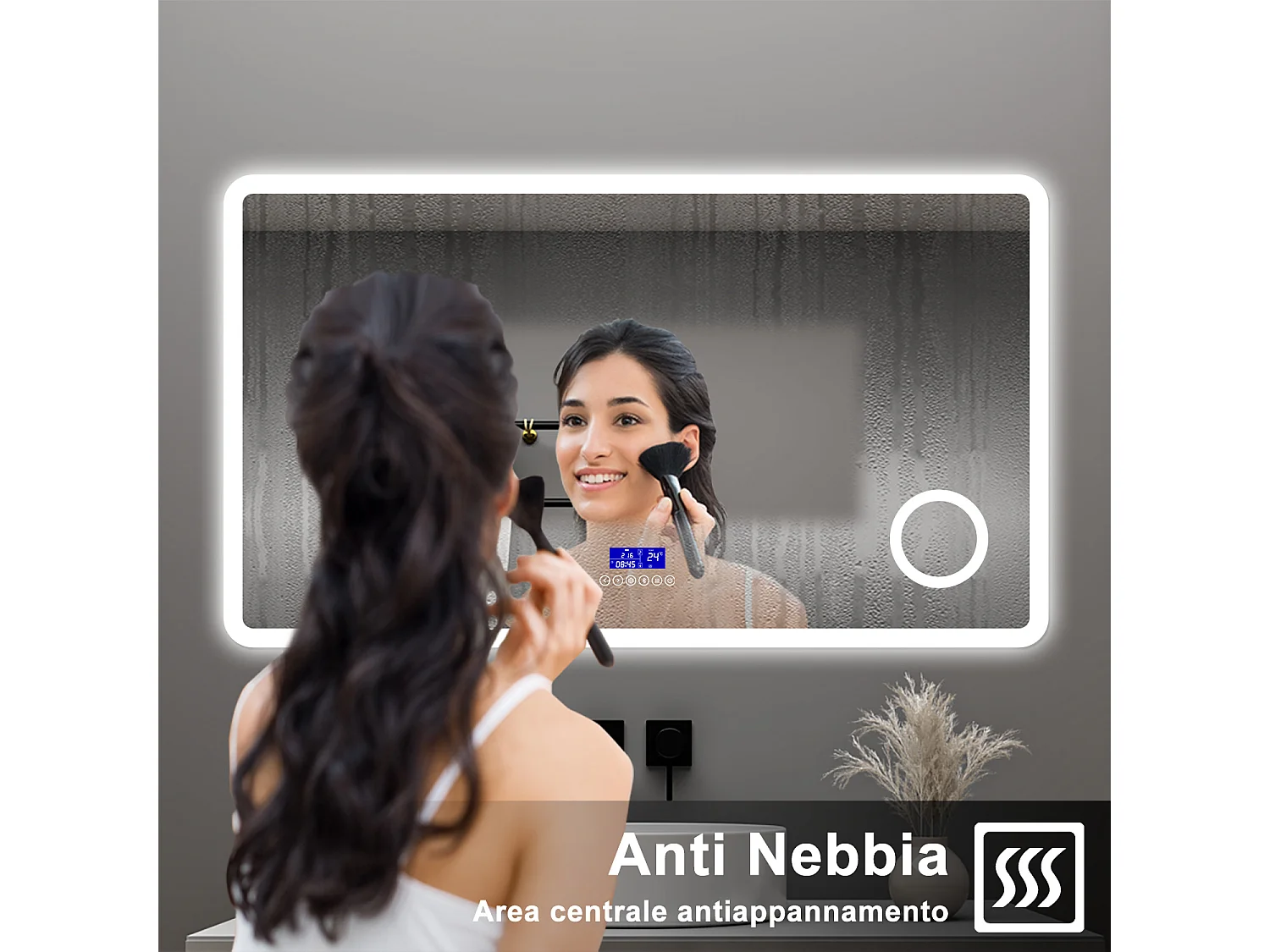 AICA Specchio da bagno 120 x 70 cm, dimmerabile, Blue tooth, Funzione Memoria, antiappannamento, 3 colori, Magnificatore, orologio