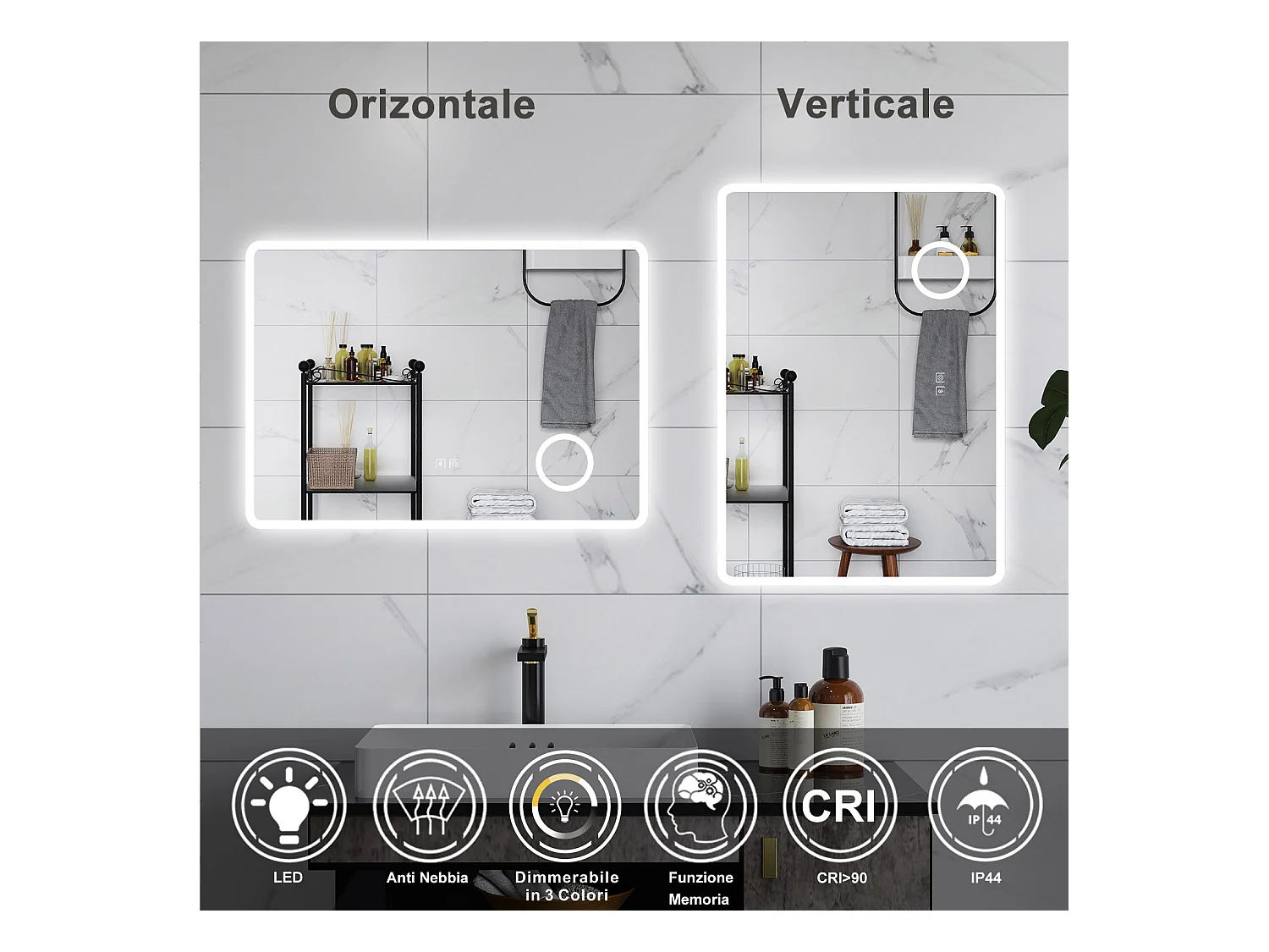 AICA Specchio da bagno 60 x 80 cm, dimmerabile, Blue tooth, Funzione Memoria, antiappannamento, 3 colori, Magnificatore