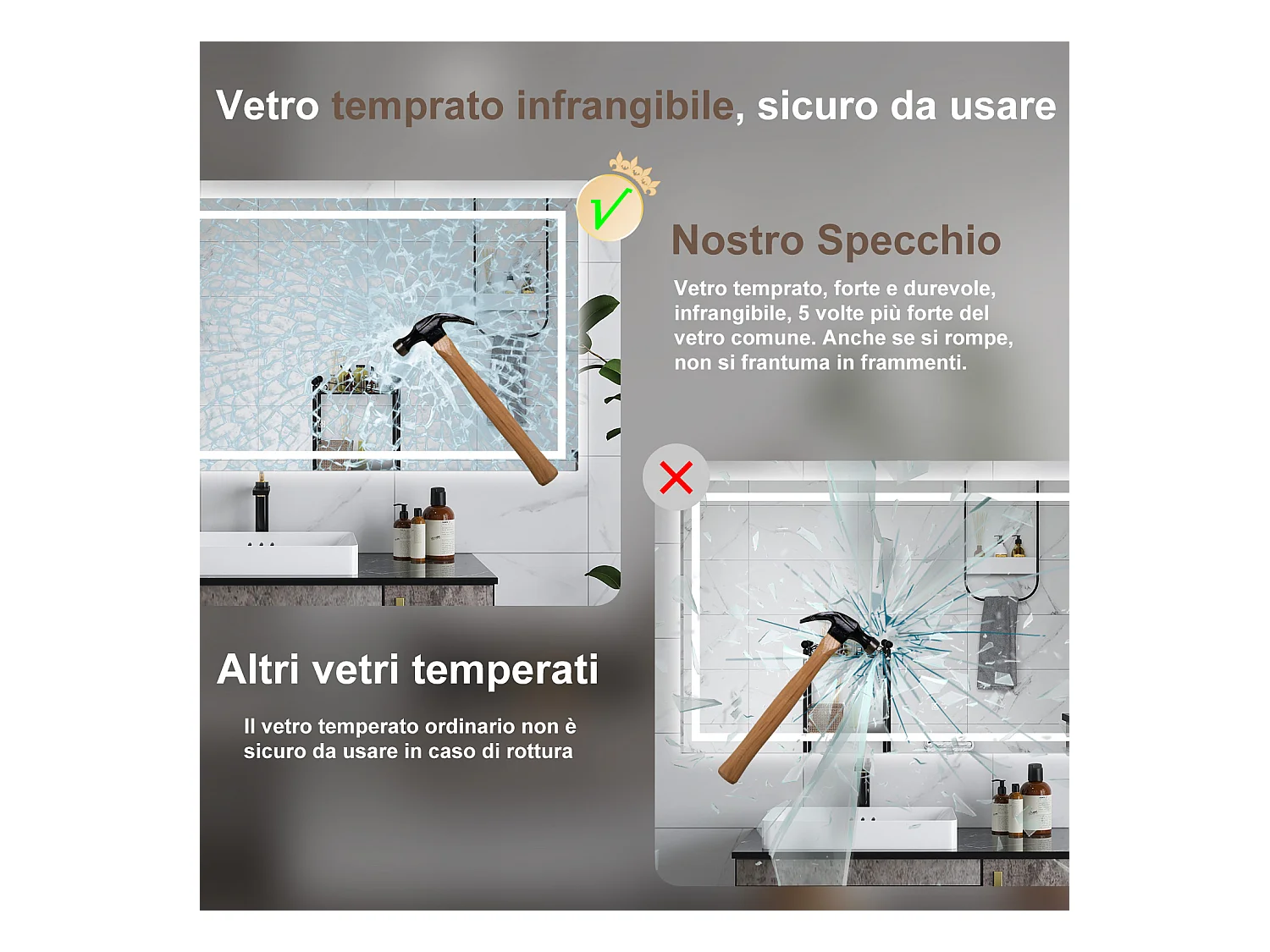 Specchio da bagno Rettangolare con 70x50cm,3 colori,Memoria, Antifog,Regorabile,Retroilluminato,doppio interruttore,