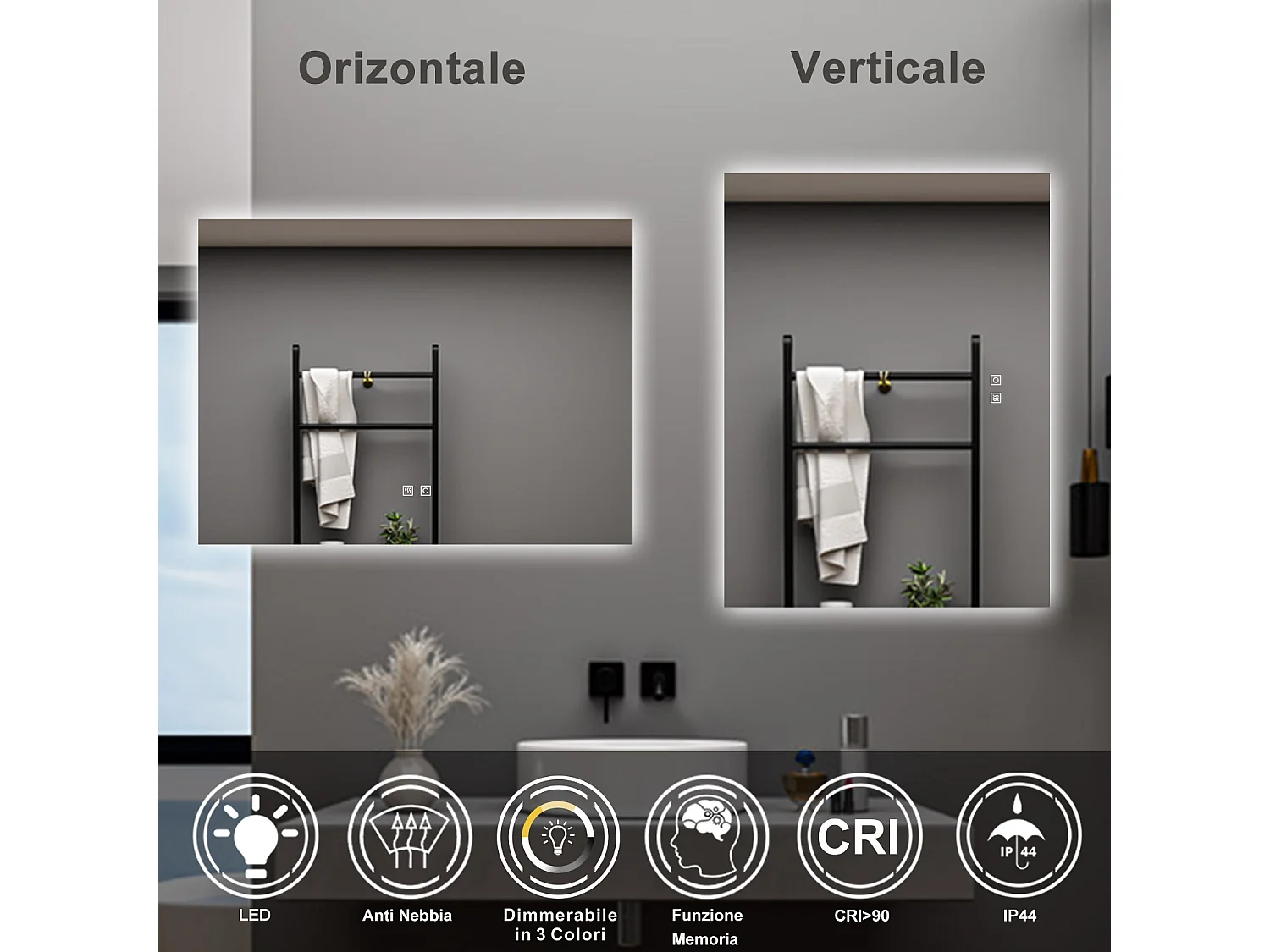 AICA SPECCHIO DA BAGNO CON LED, 80x60cm, Disappannamento, Funzione Memoria, Infinitamente Dimmerabile