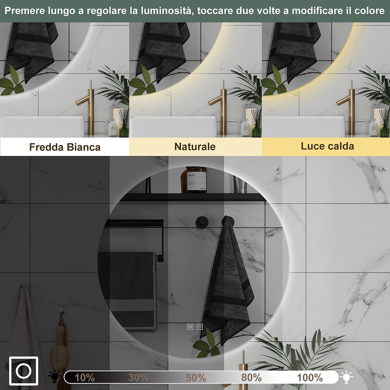 AICA Specchio da bagno 80 x 80 cm, 3 colori, antiappannamento, dimmerabile, interruttore touch, Funzione Memoria