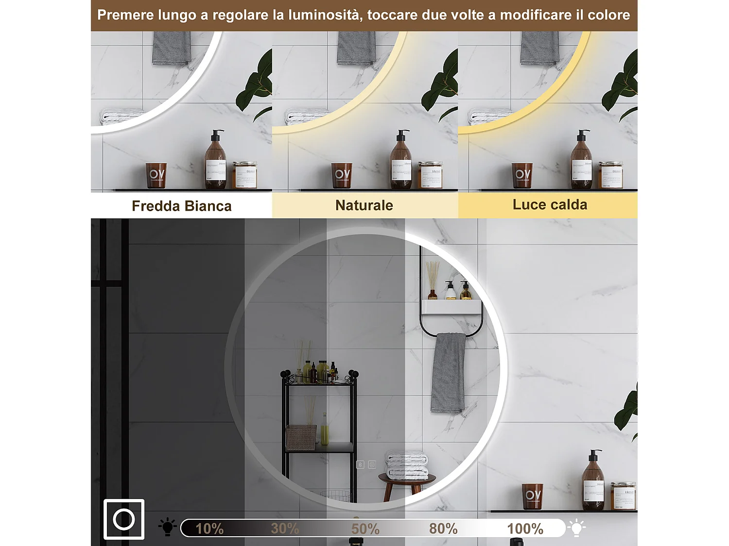 AICA Specchio da bagno rotondo con LED,Diametro 80cm,3 Temperature di Colore,Disappannamento,Infinitamente Dimmerabile