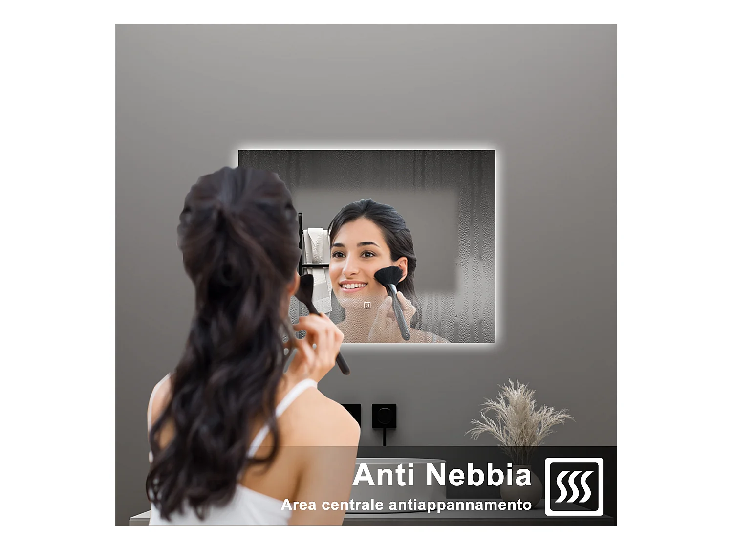 Specchio da bagno Rettangolare con 90x70cm,3 colori,Memoria, Antifog,Regorabile,Retroilluminato,doppio interruttore,