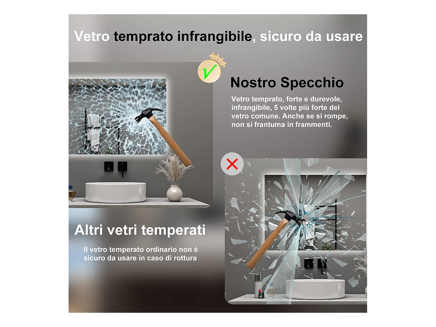 Aica Specchio da bagno a LED, 90x70cm, Disappannamento, Funzione Memoria, Infinitamente Dimmerabile