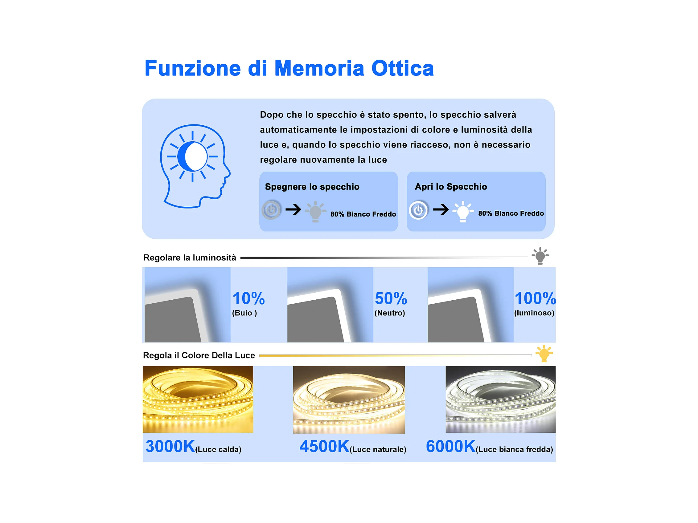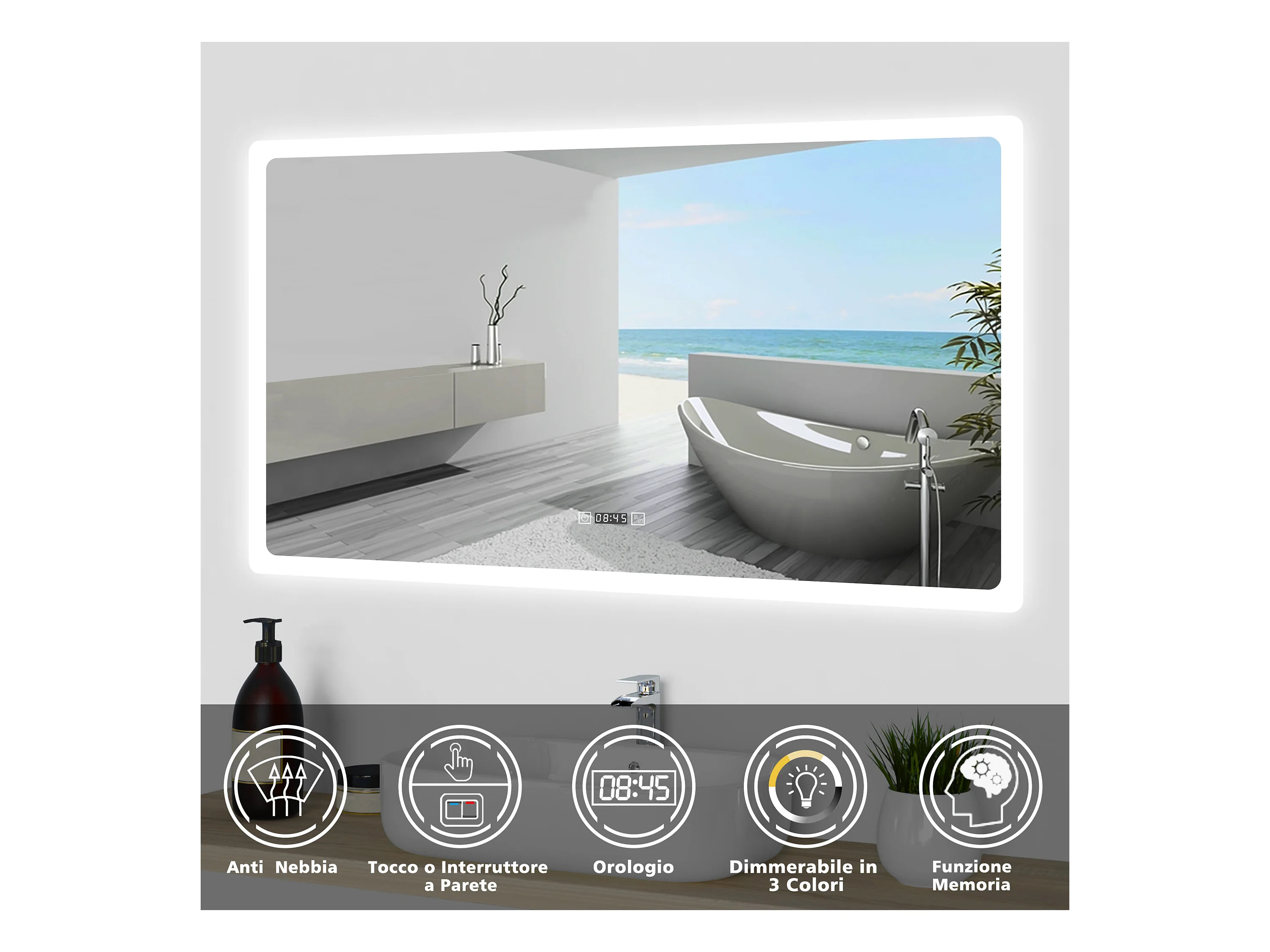 Specchio da bagno Rettangolare con 120x70cm,Blue tooth,3 colori,Memoria, Antifog,Regorabile,Retroilluminato,doppio interruttore,