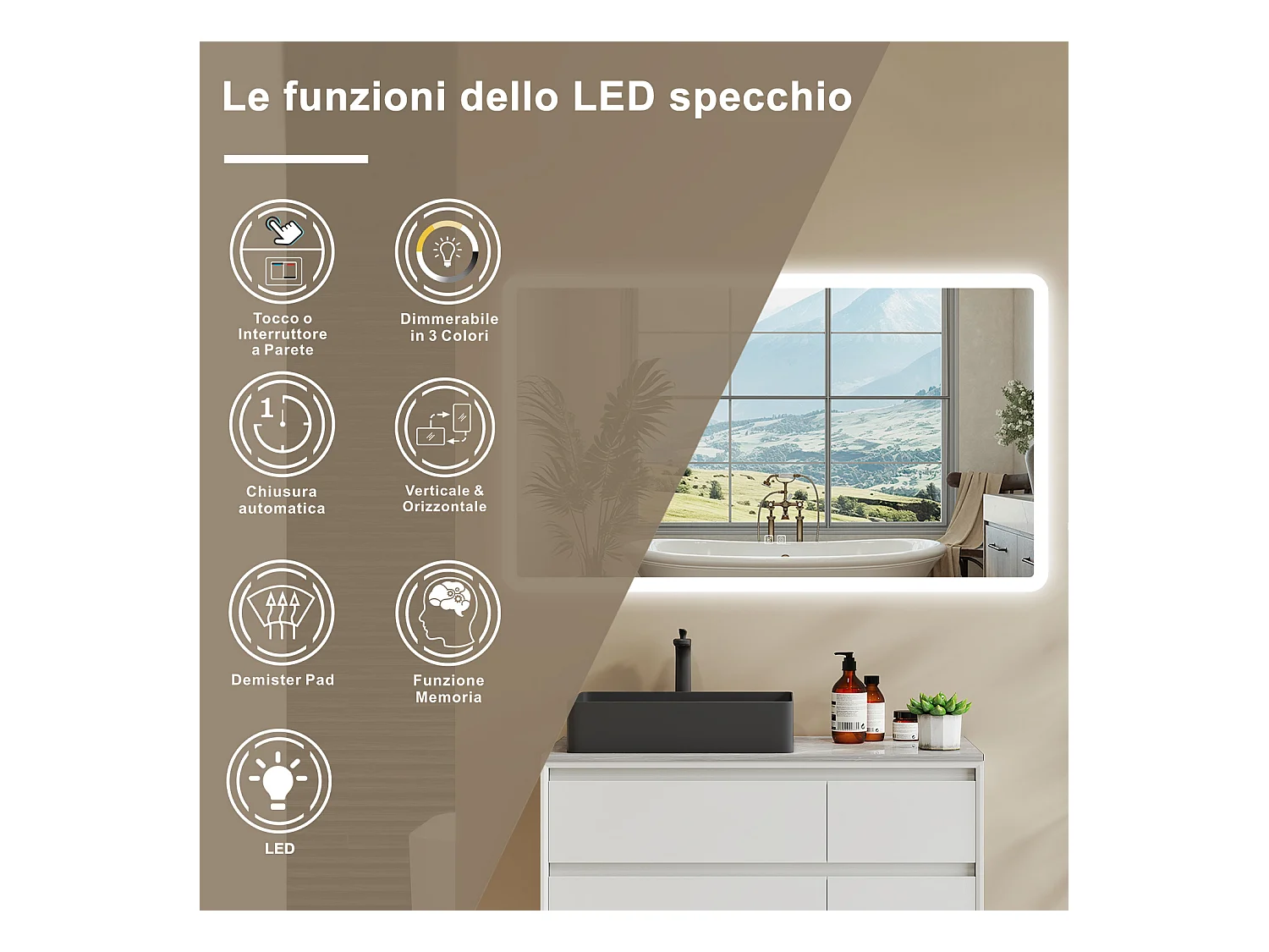 AICA Specchio da bagno 120 x 70 cm, dimmerabile, Blue tooth, Funzione Memoria, antiappannamento, 3 colori, Magnificatore