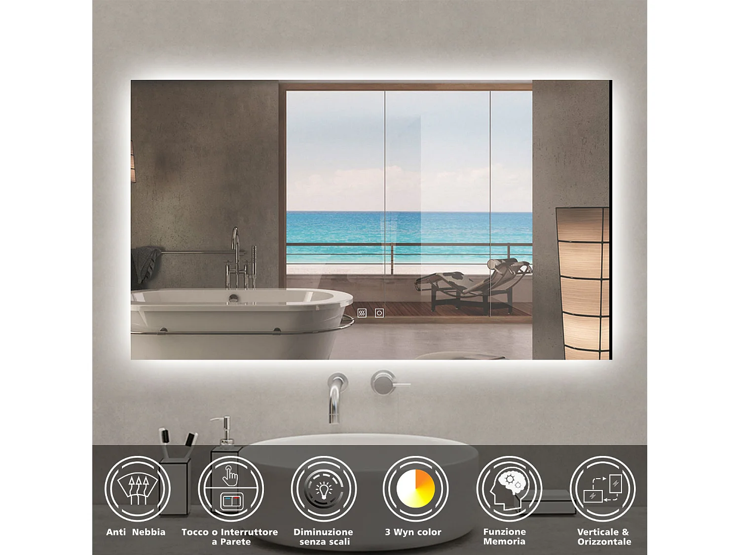 AICA Specchio da bagno 100 x 60 cm, antiappannamento, dimmerabile, interruttore touch, Funzione Memoria
