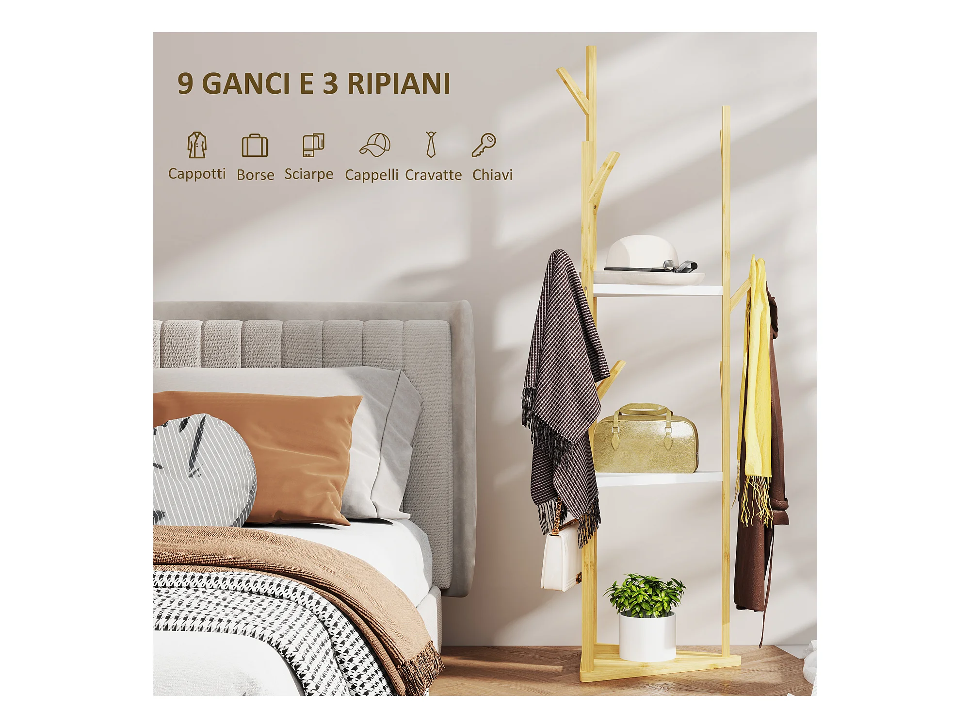 Albero appendiabiti da terra con 9 ganci e 3 ripiani legno e bianco