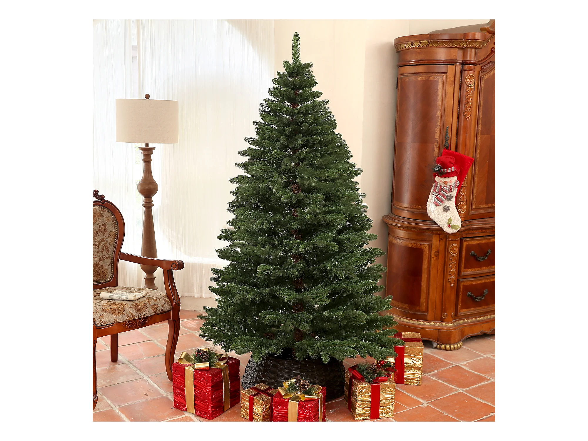 Albero di Natale Preilluminato con Palline e Pigne 210 cm
