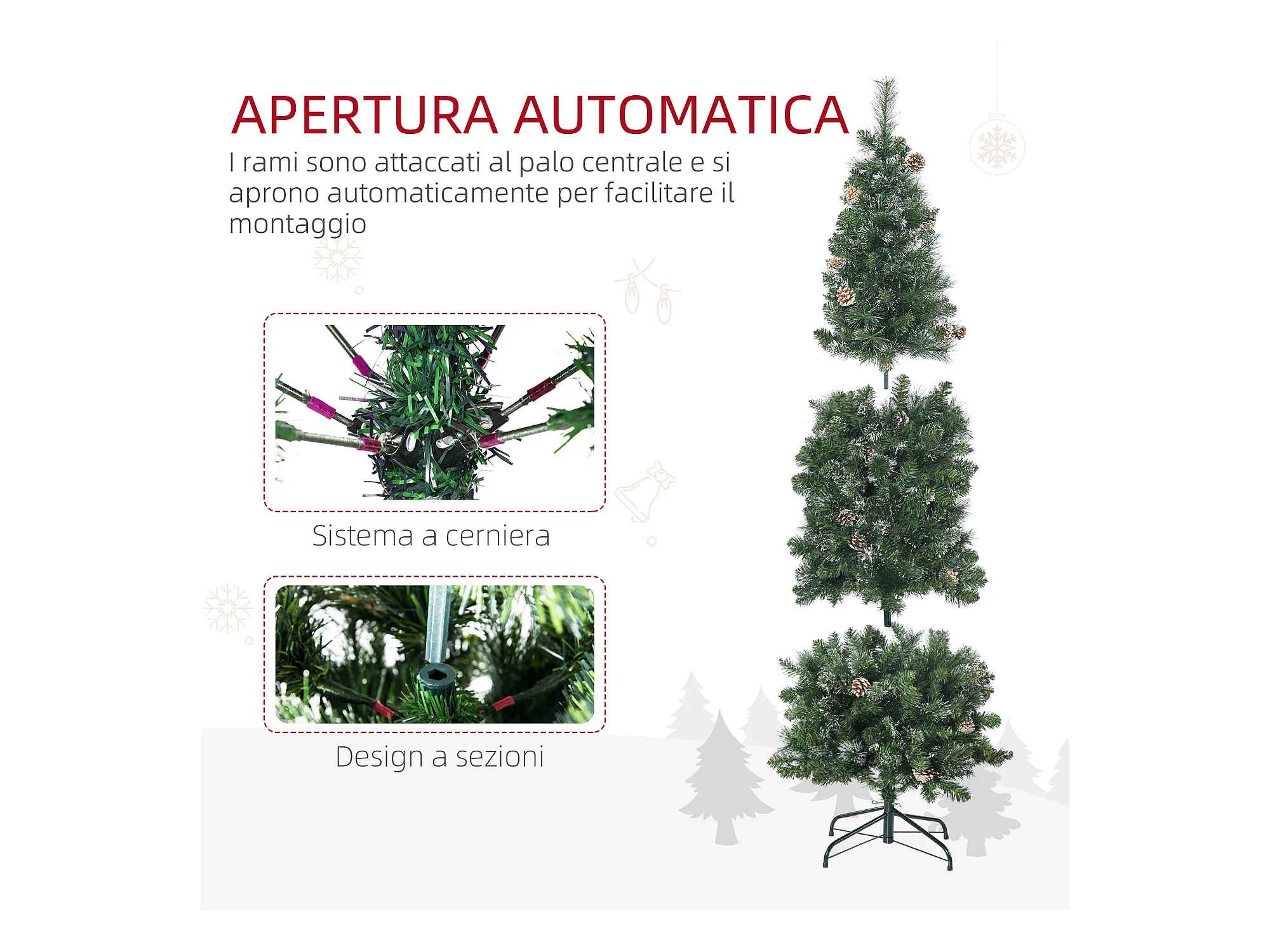 Albero di natale artificiale 1050 rami e base pieghevole Ø120x180 cm