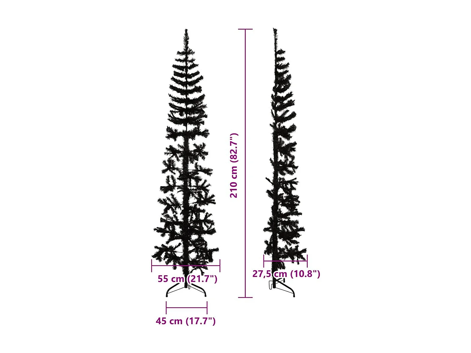 Albero di Natale artificiale sottile con supporto nero 210 cm