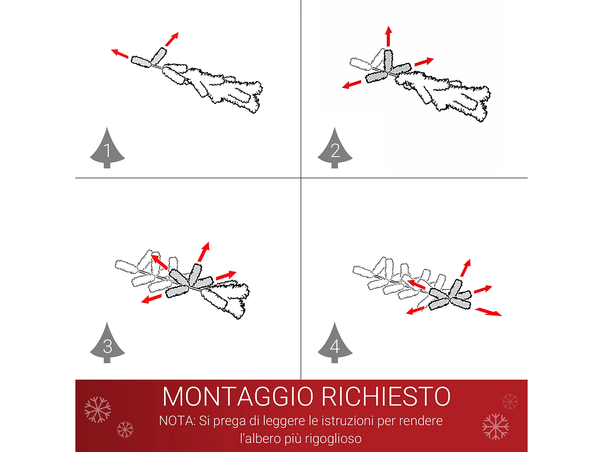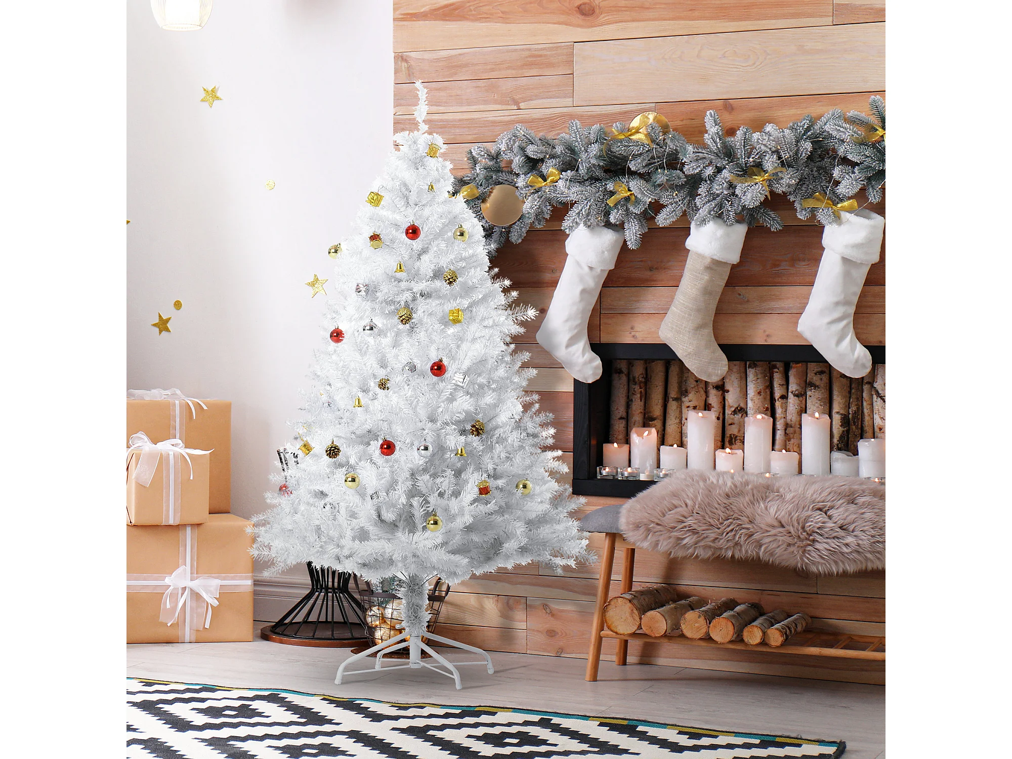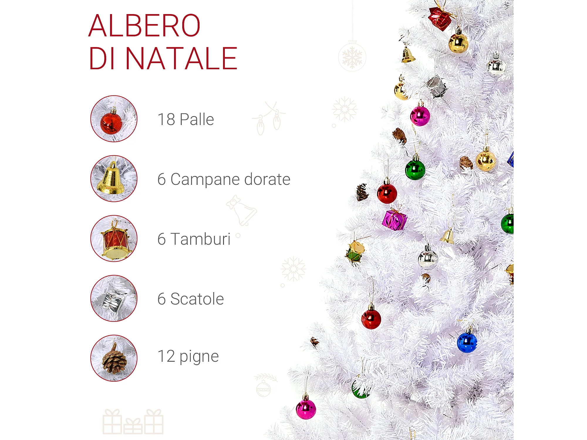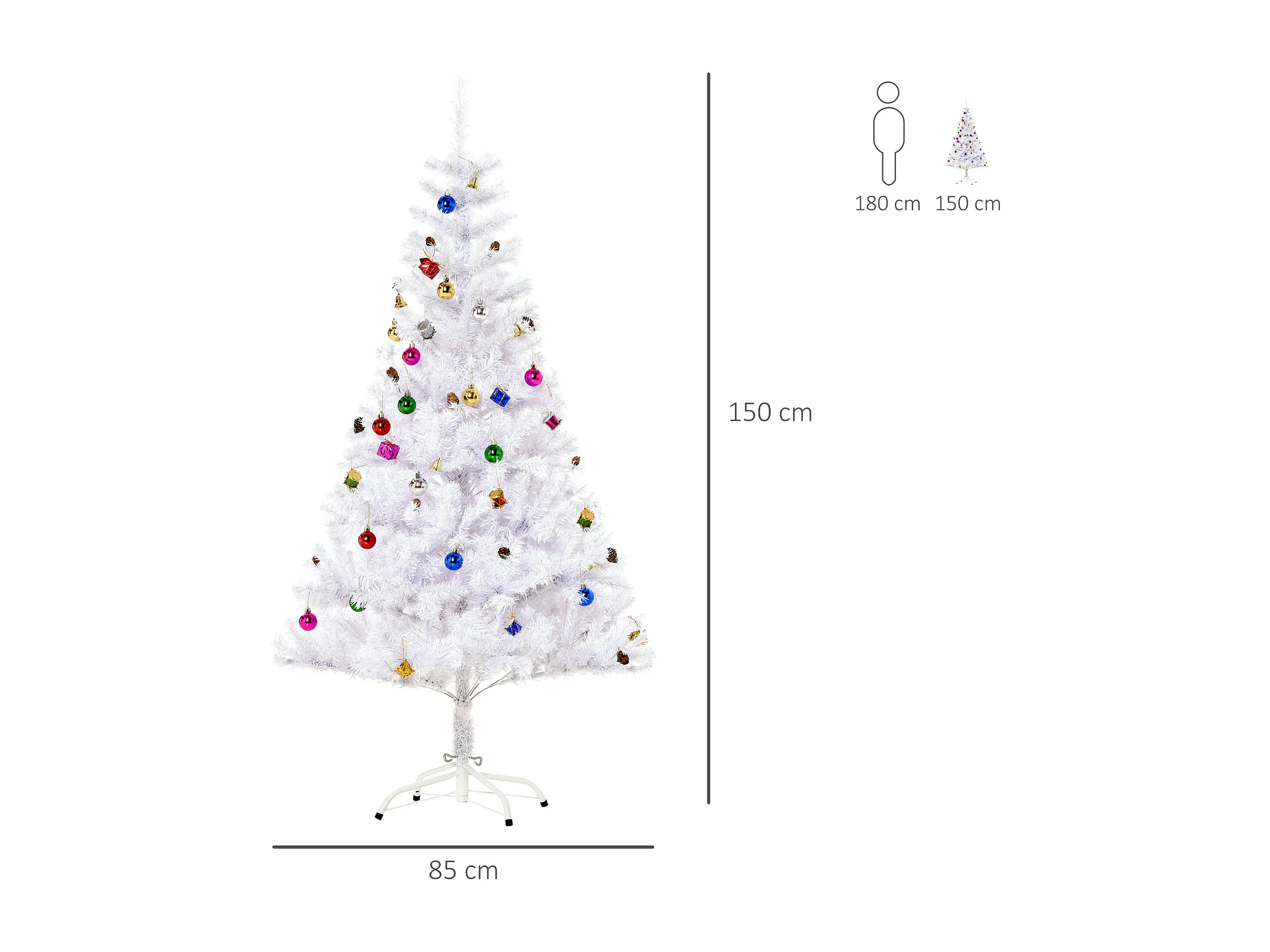 Albero di natale con addobbi e rami in pvc bianco