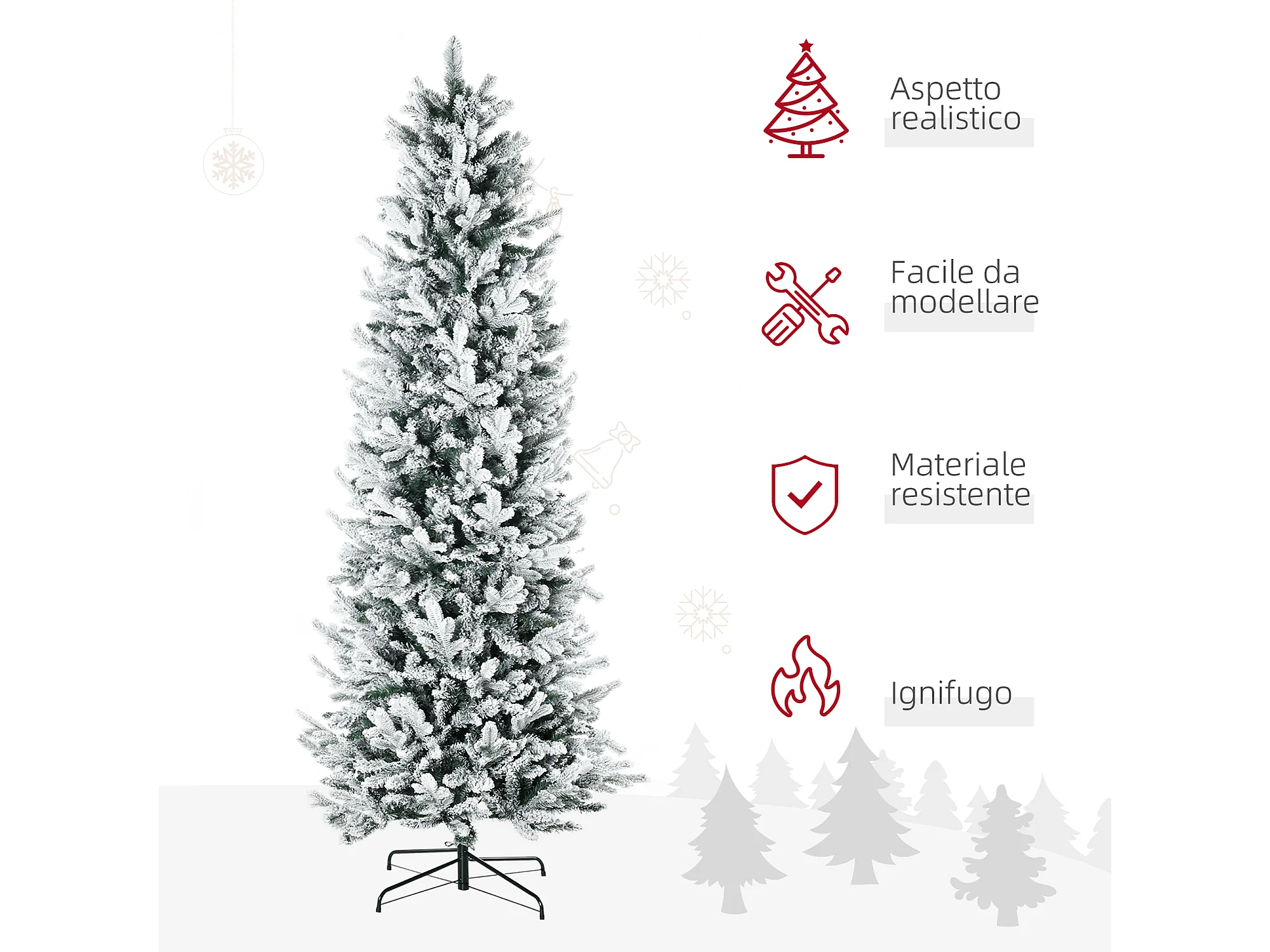 Albero di natale innevato alto 225cm con pigne e base in acciaio