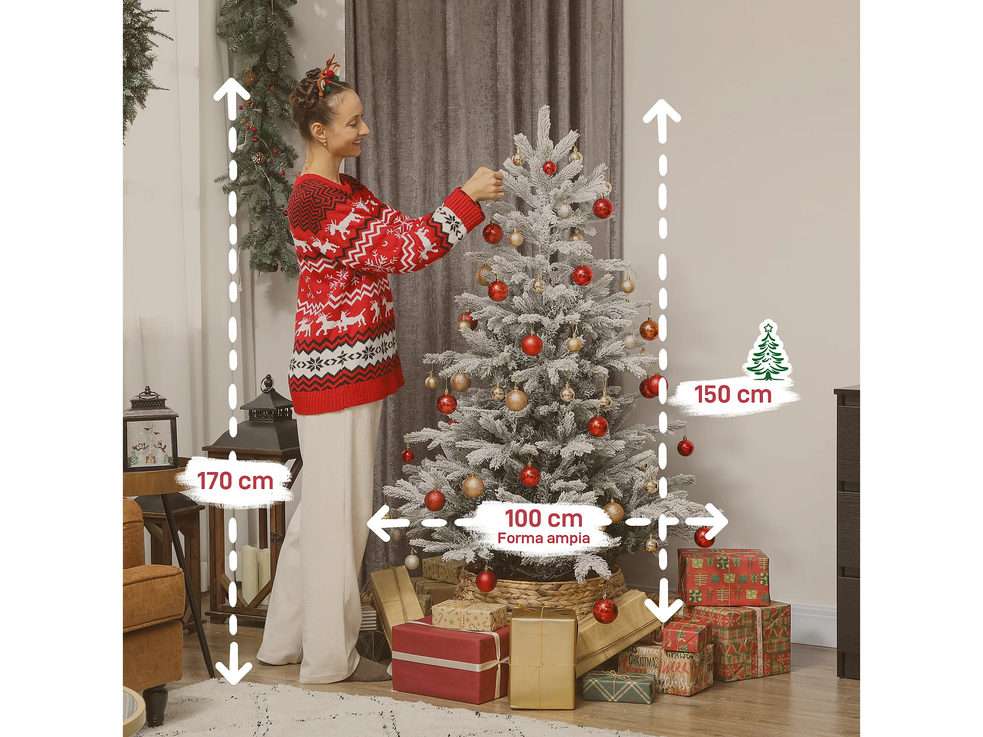 Albero di natale innevato alto 150 cm con base in metallo pieghevole