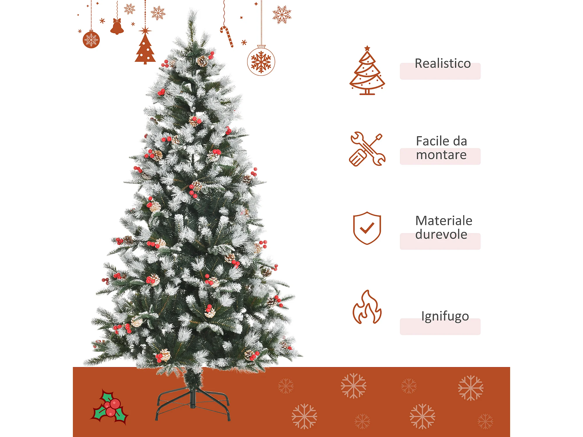 Albero di natale innevato con pigne e bacche rosse alto 180cm