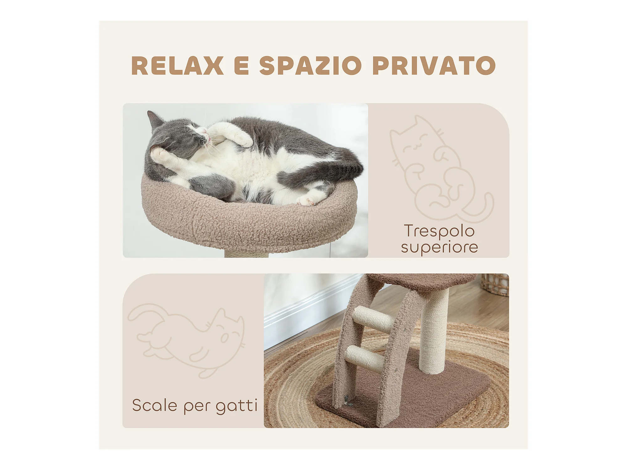 Tiragraffi per gatti a 2 livelli in sisal con casette in peluche marrone