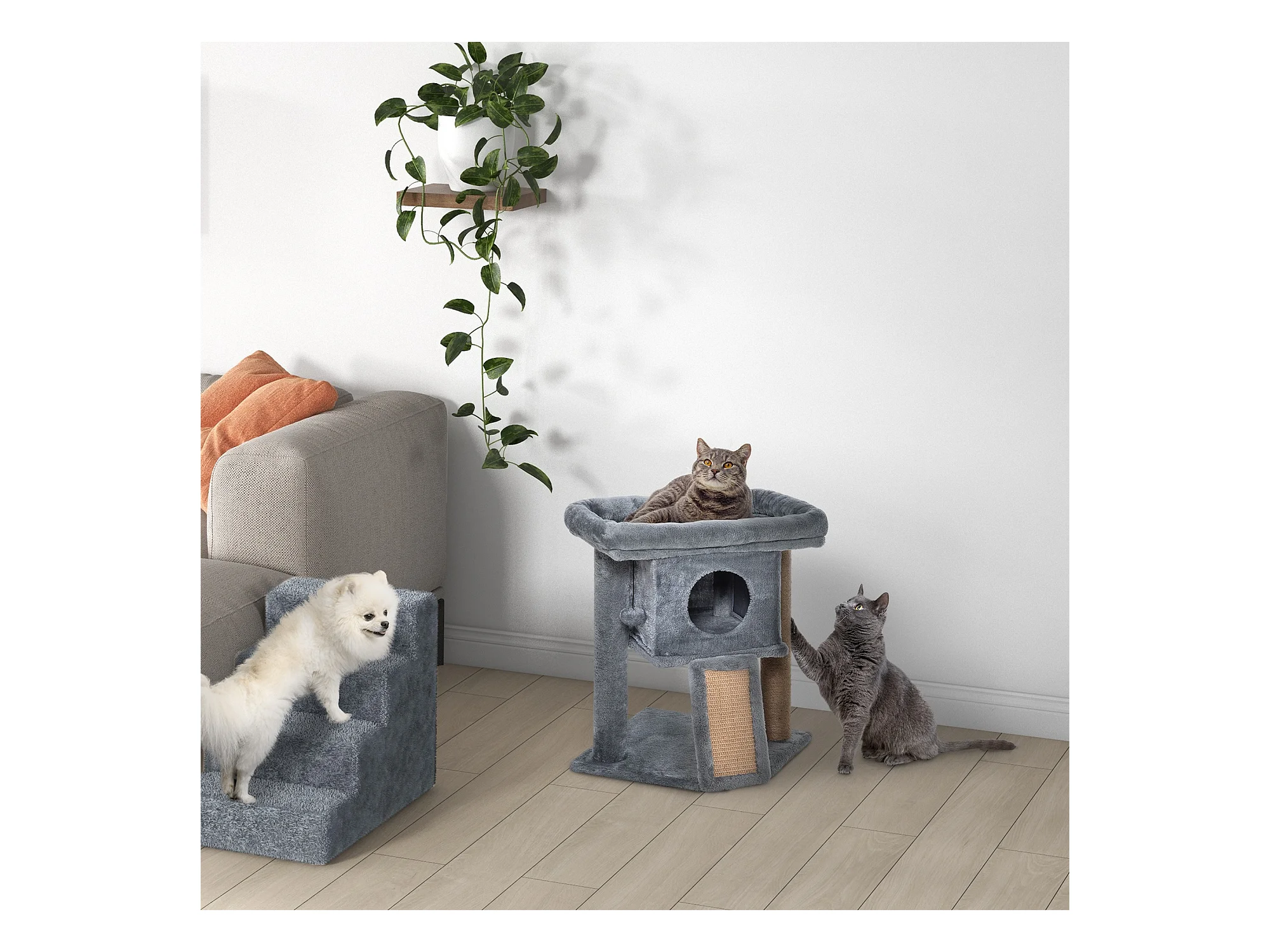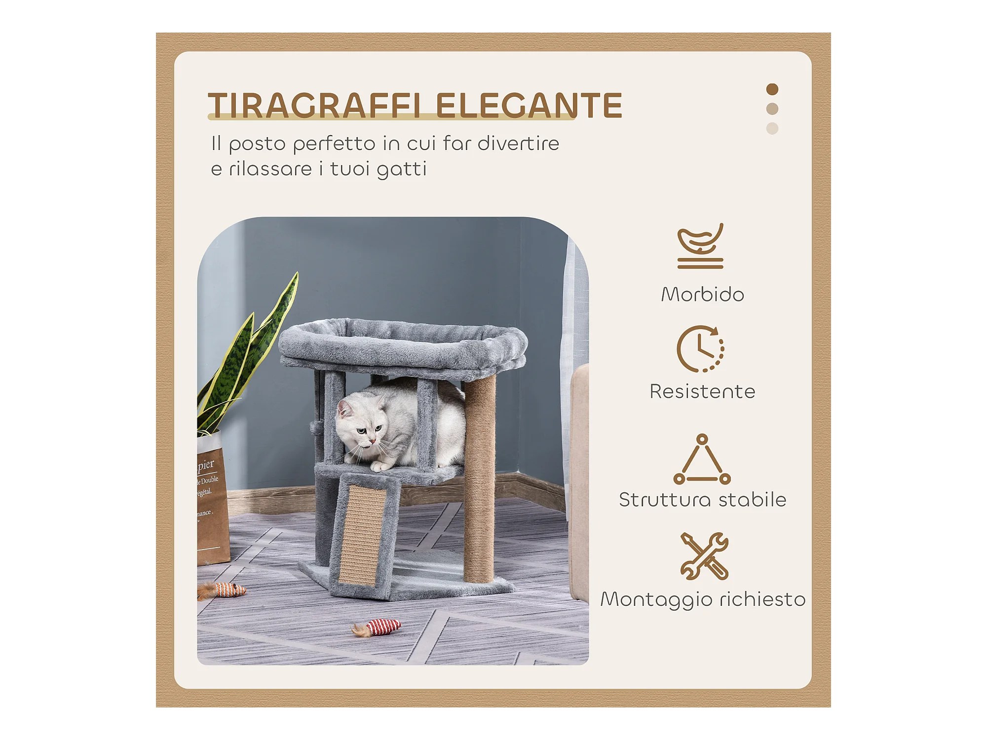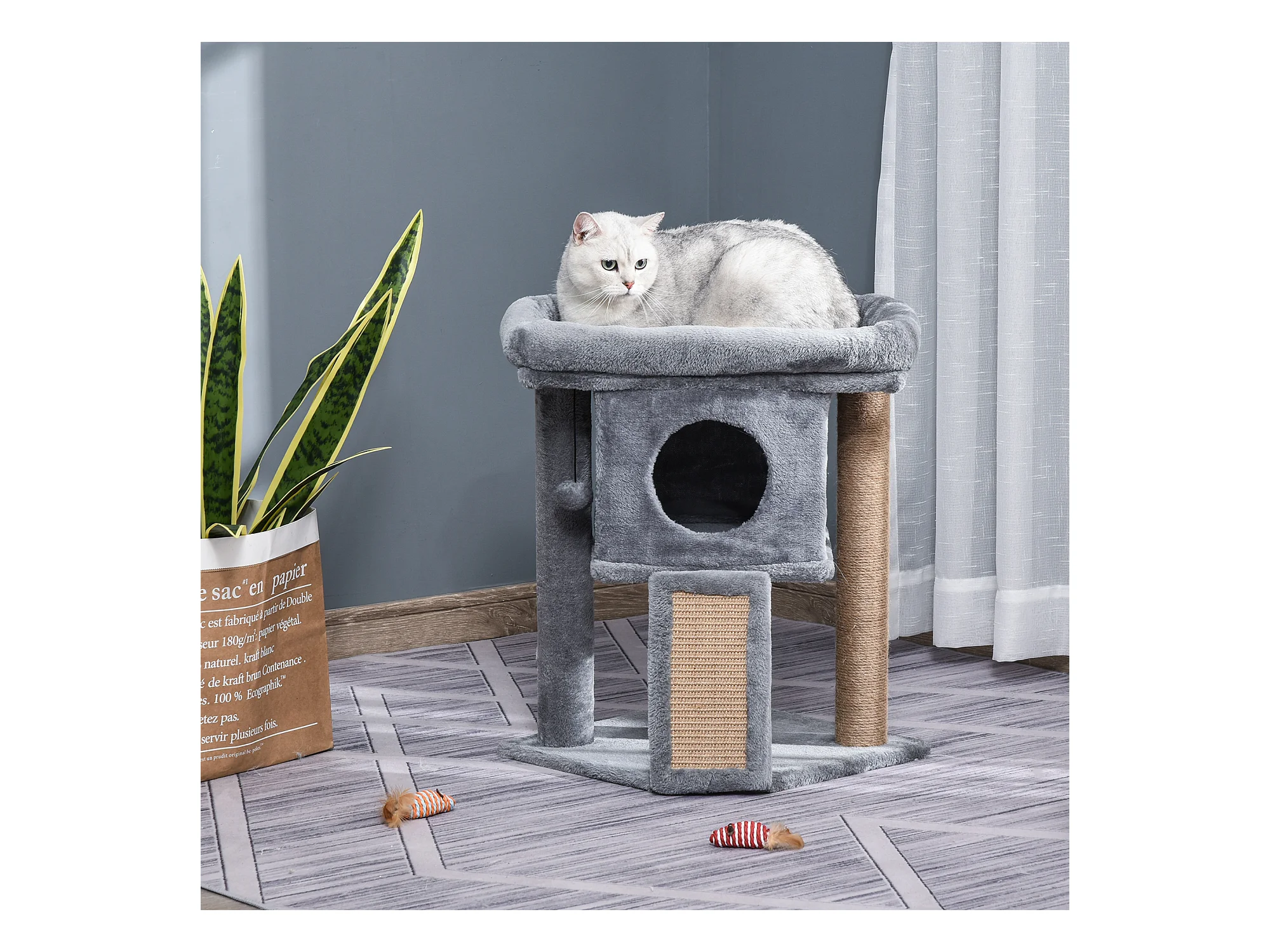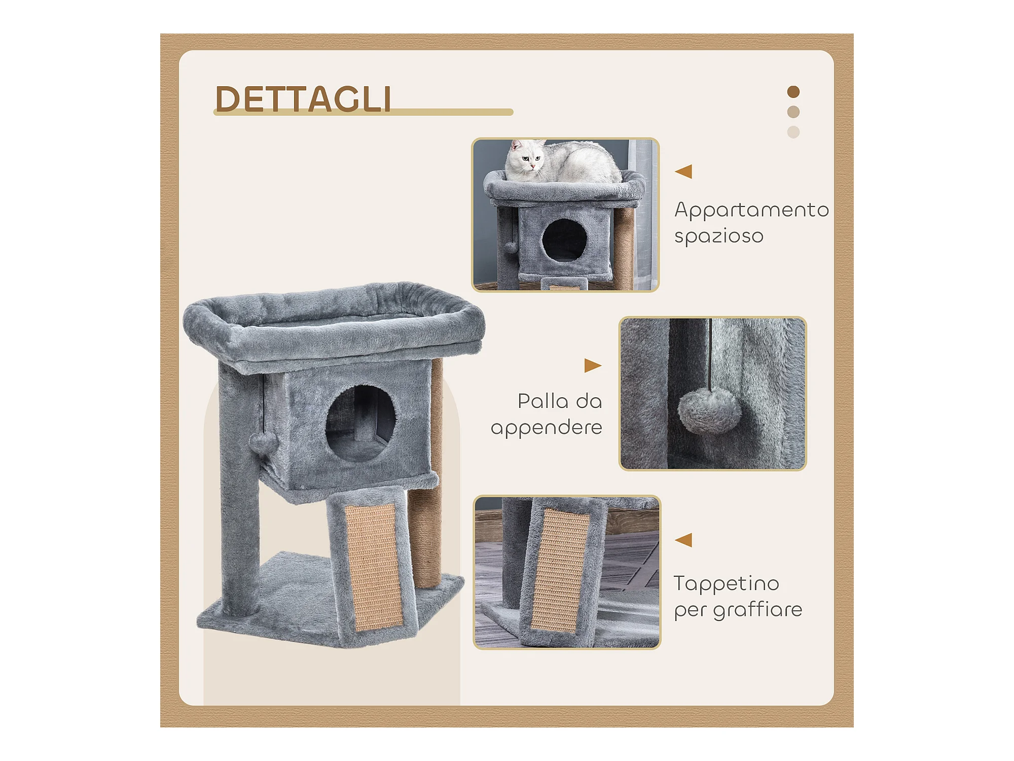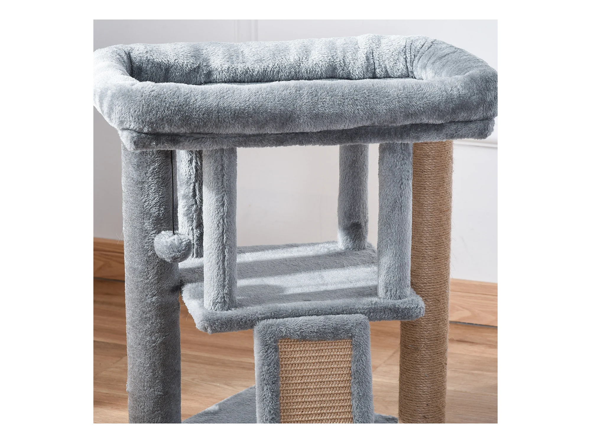 Tiragraffi per gatti in peluche con palo sisal, cuccia e 2 palline grigio