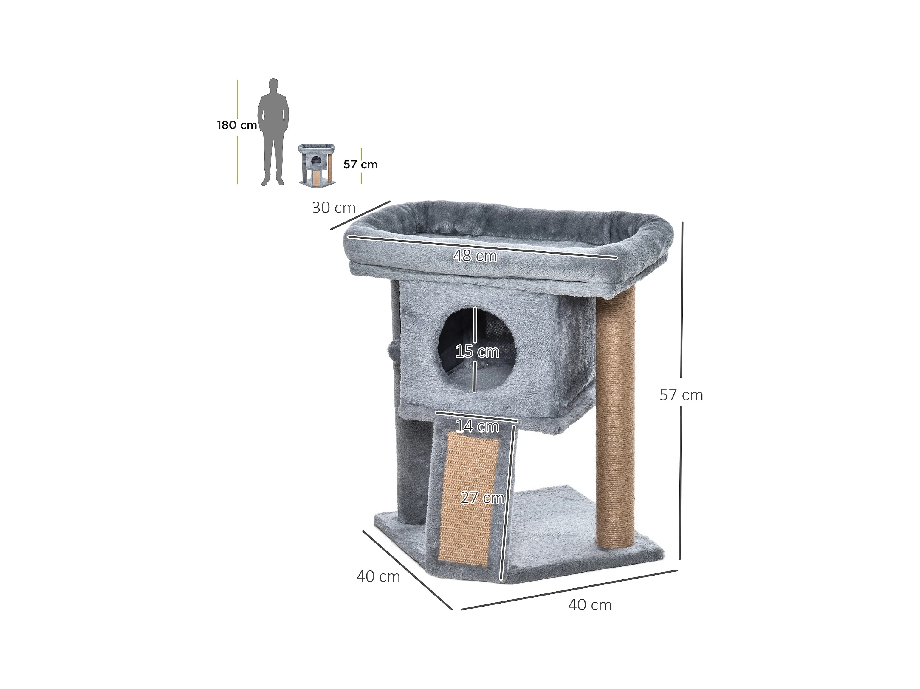 Albero tiragraffi con cuccia in peluche grigio e corda sisal 60x49x130cm
