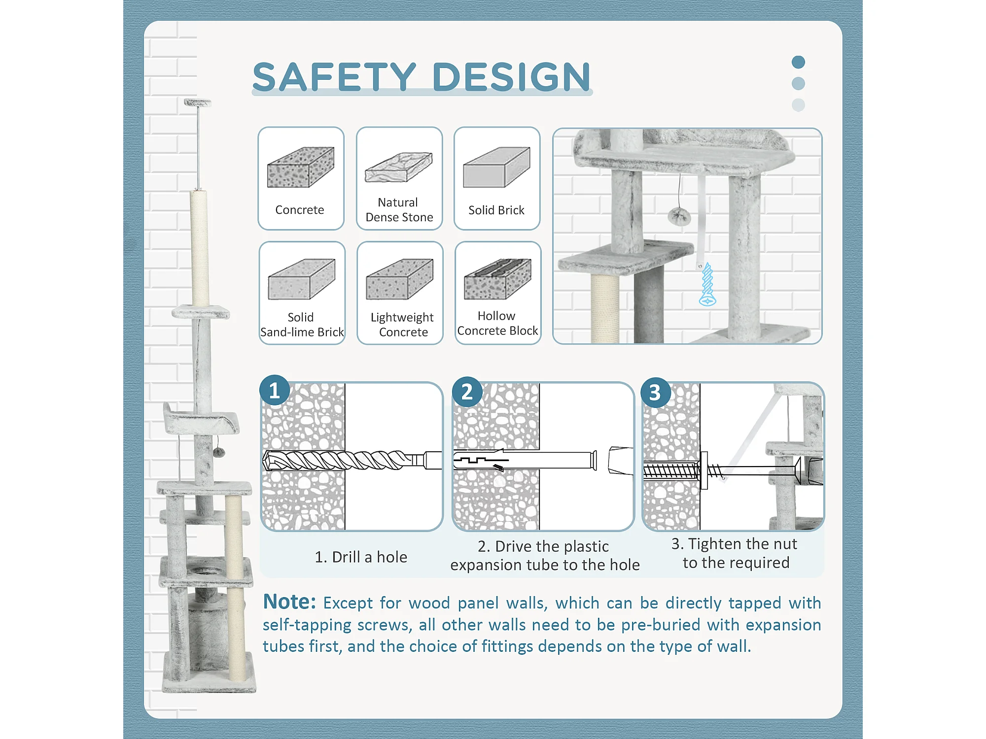 Albero per gatti - 60 x 48 x 98 cm - con trampolino a 3 livelli + cuscini rimovibili + palline da gioco - Legno - Grigio