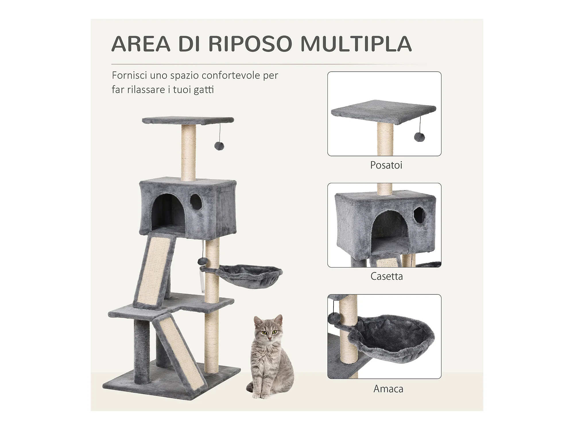 Albero per gatti con amaca lettino casette e posatoi grigio e bianco