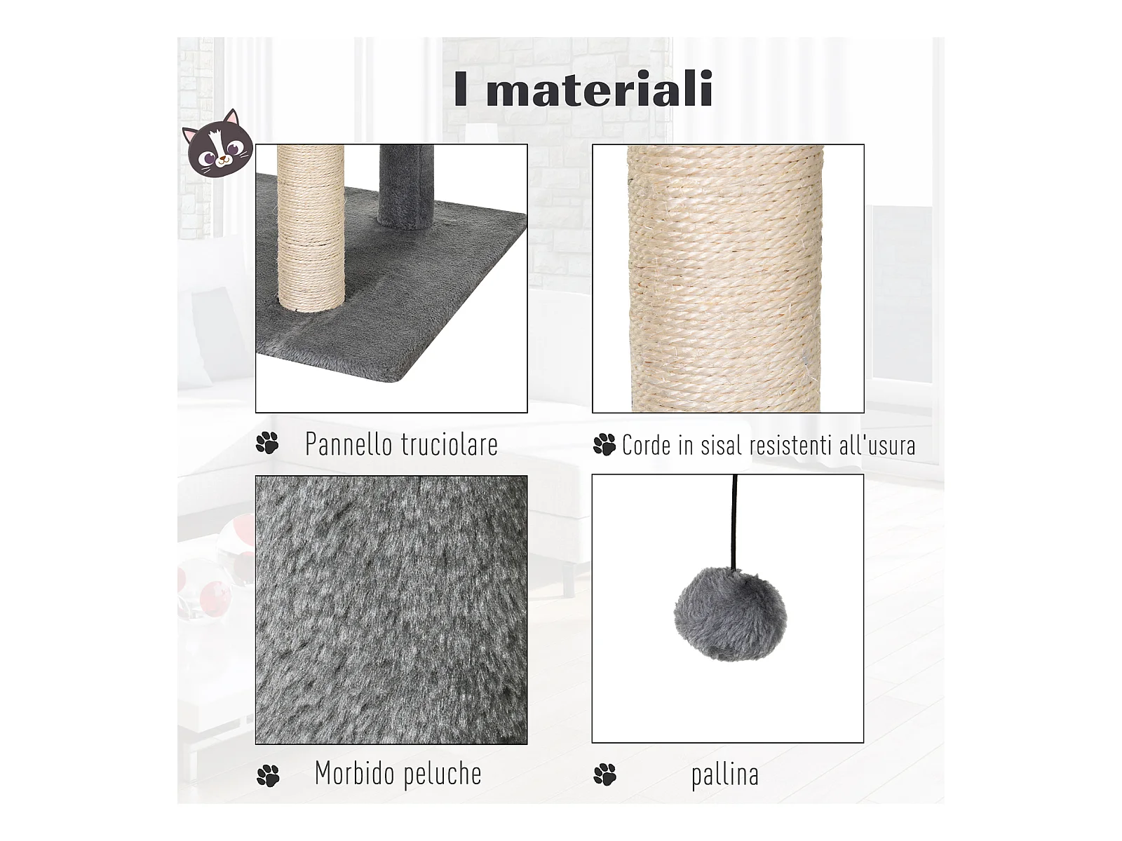 Albero tiragraffi con cuccia in peluche grigio e corda sisal 60x49x130cm