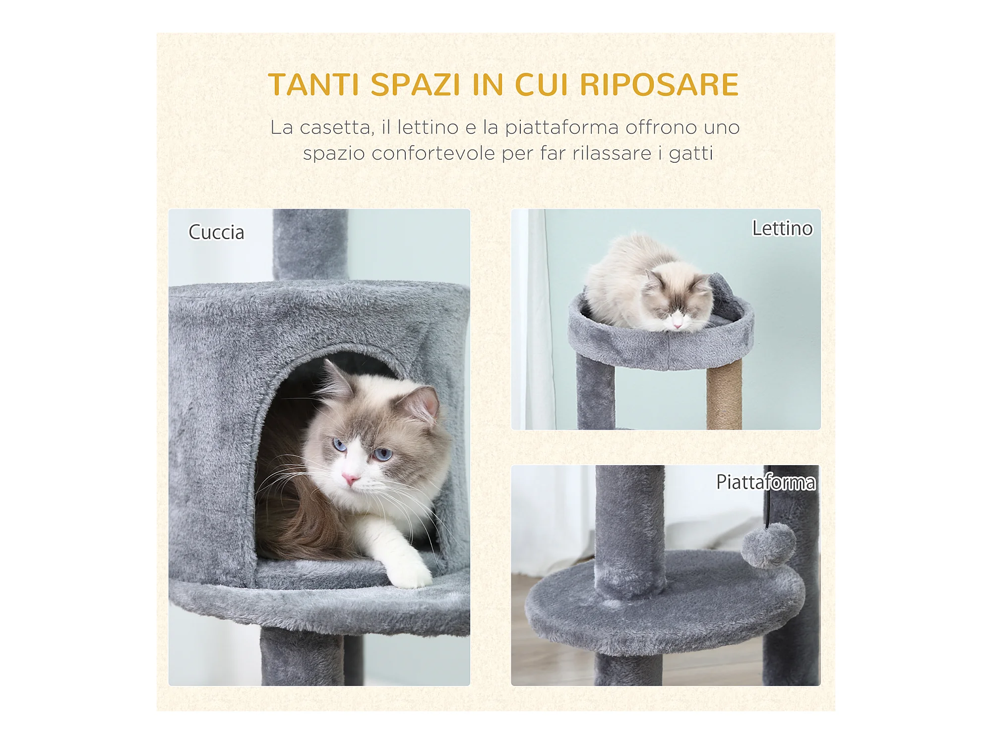 Albero tiragraffi con lettino e casetta rivestimento in peluche grigio