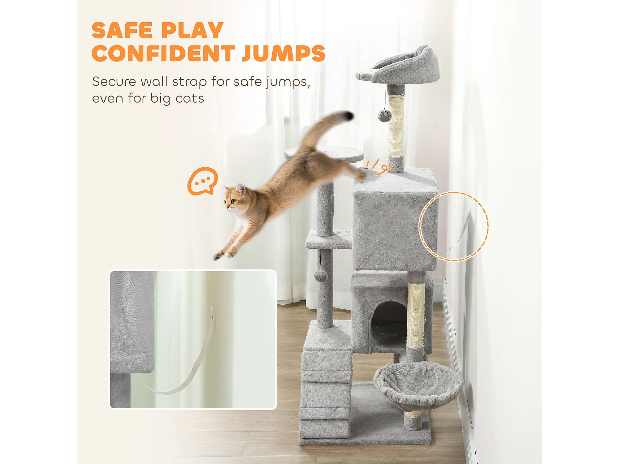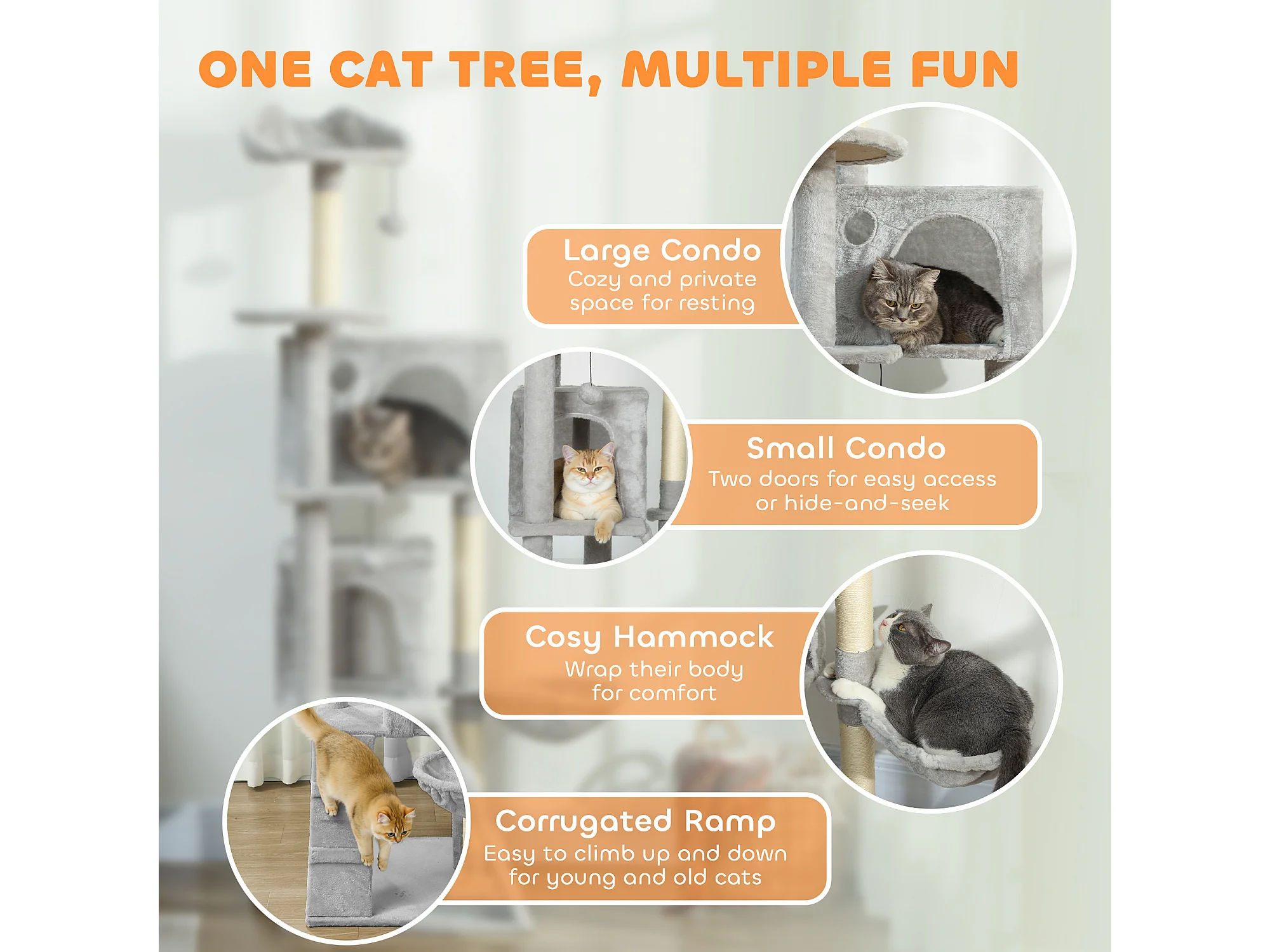 Albero tiragraffi per gatti alto 160 cm con 2 casette e amaca grigio