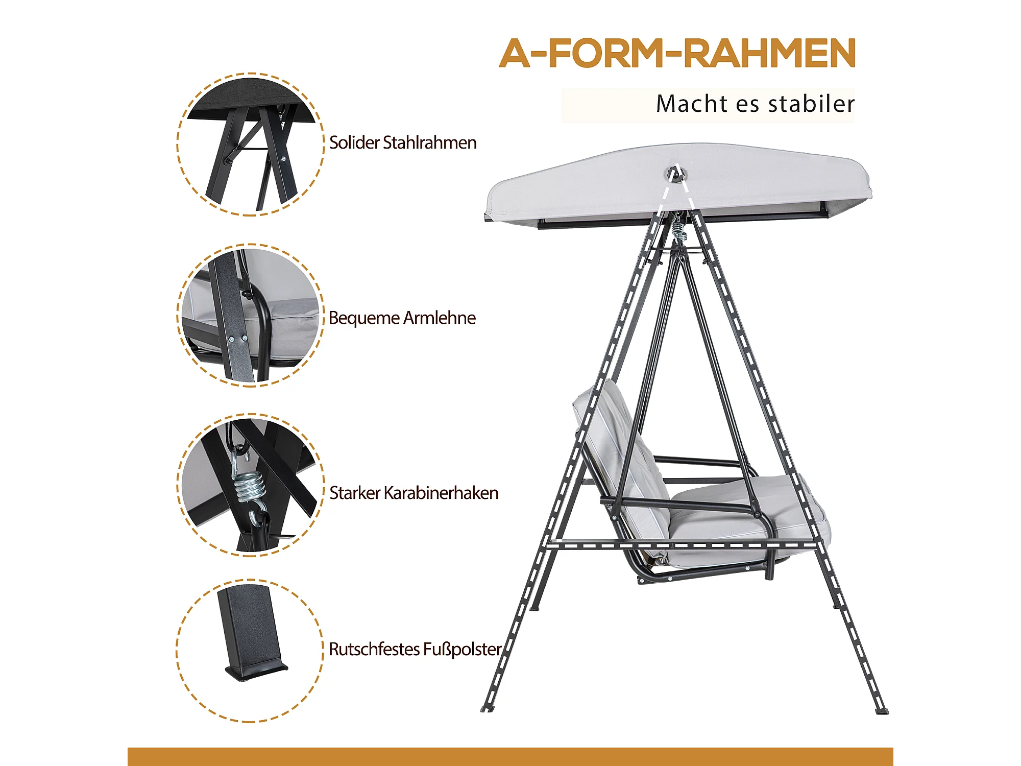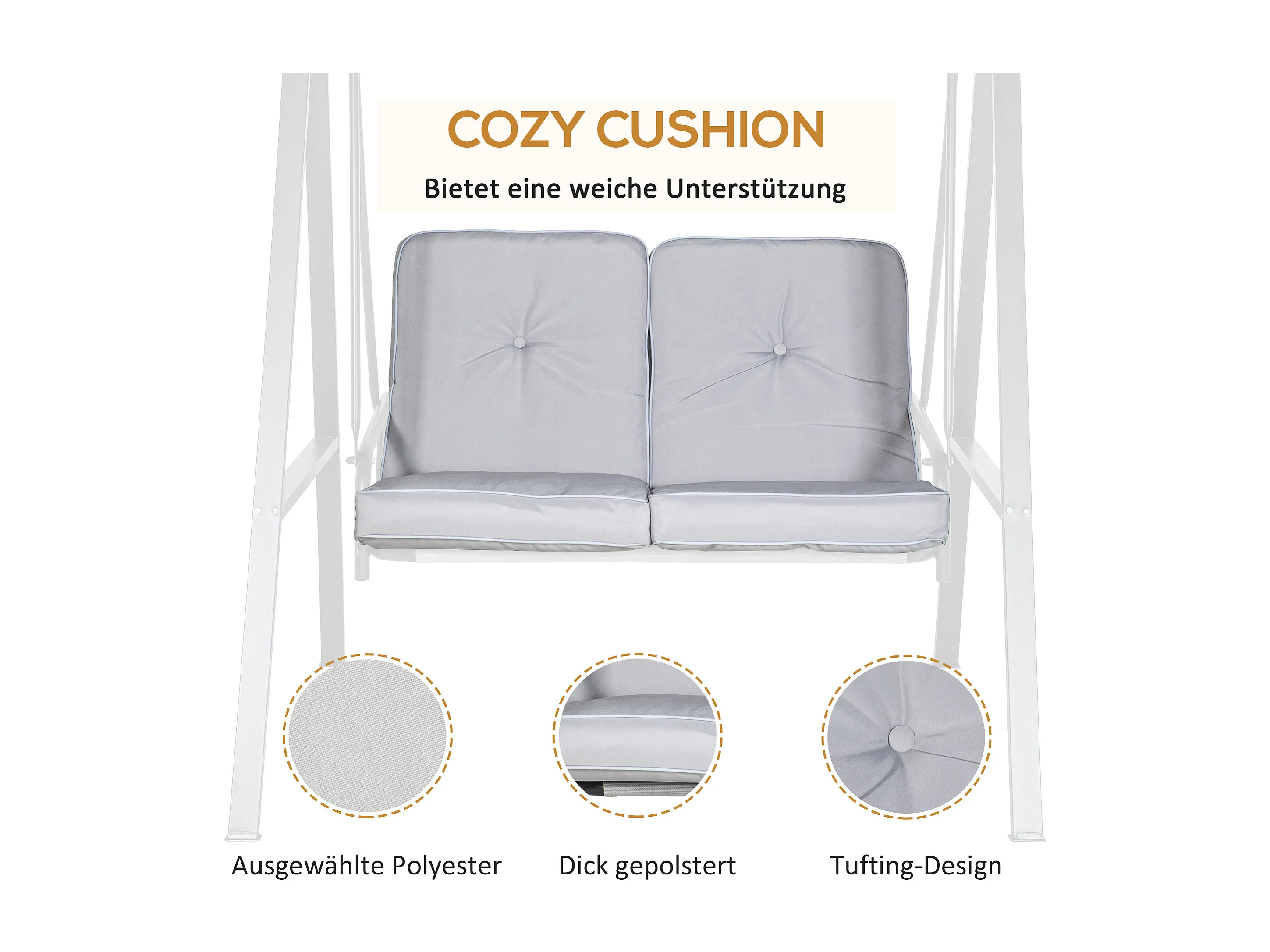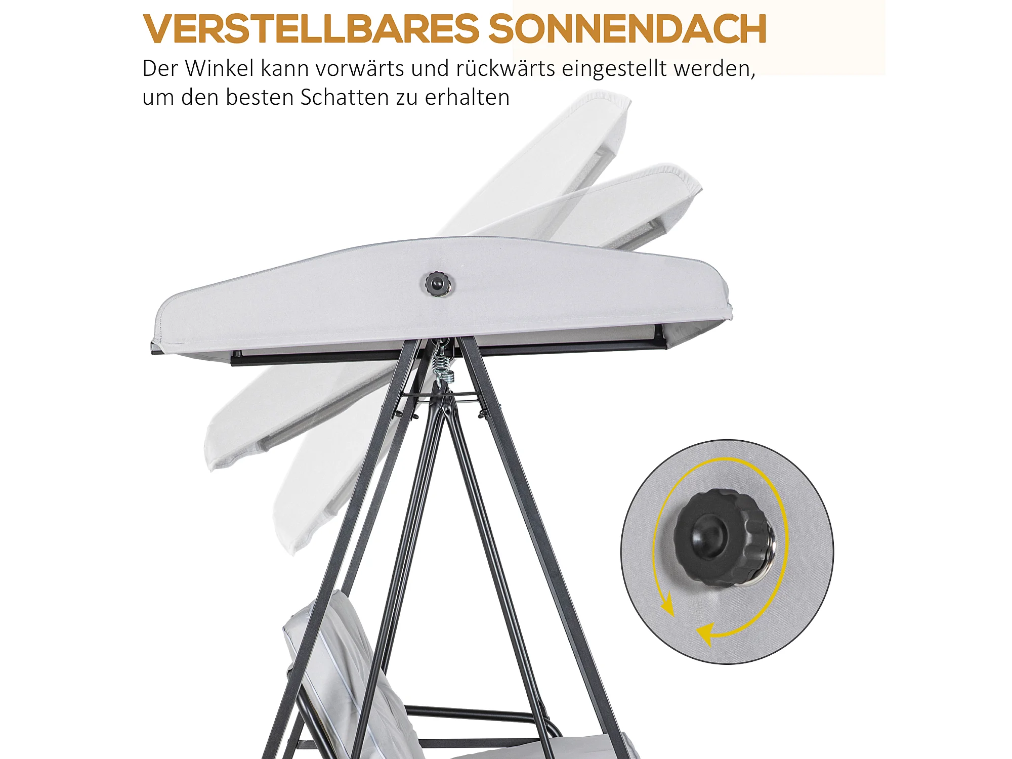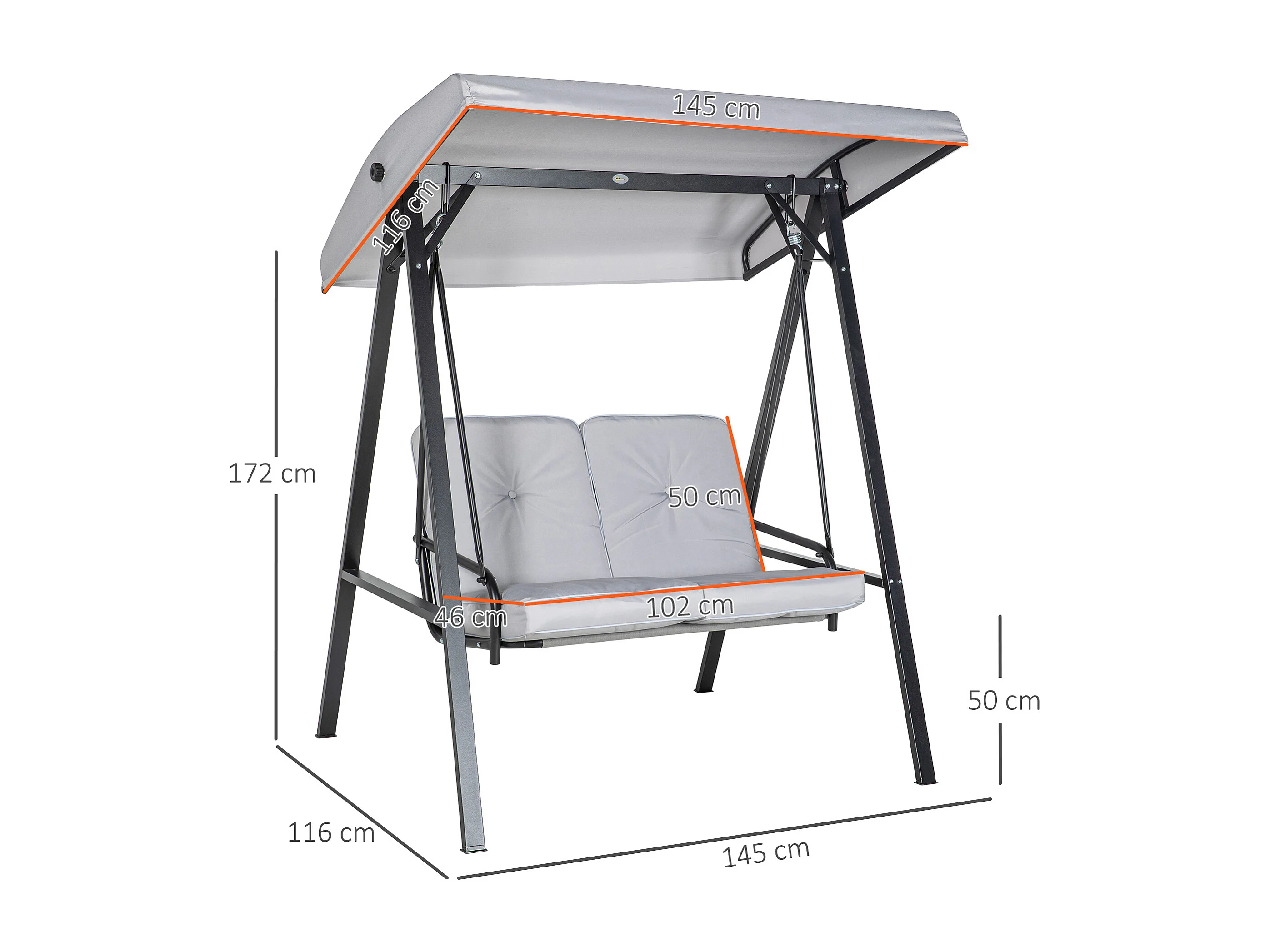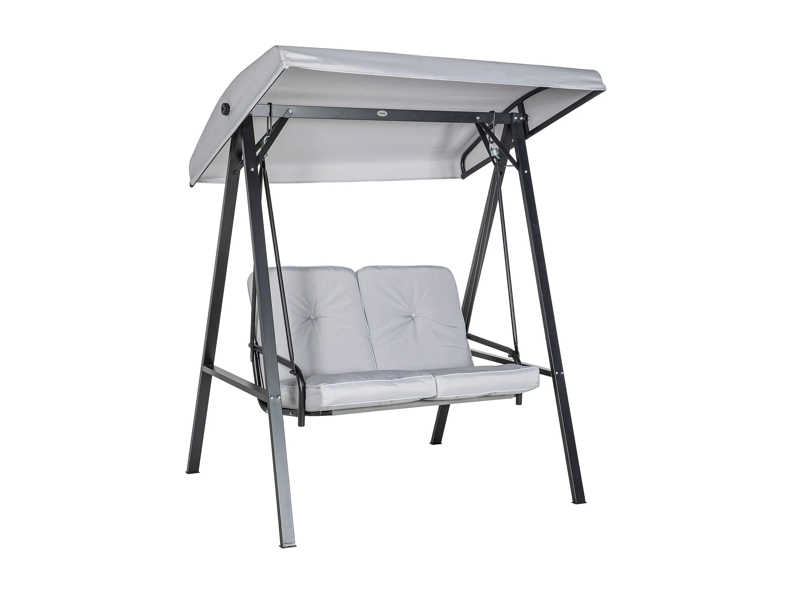 Altalena a 2 posti con tetto inclinabile, cuscini spessi, acciaio, grigio (145x116x172cm)