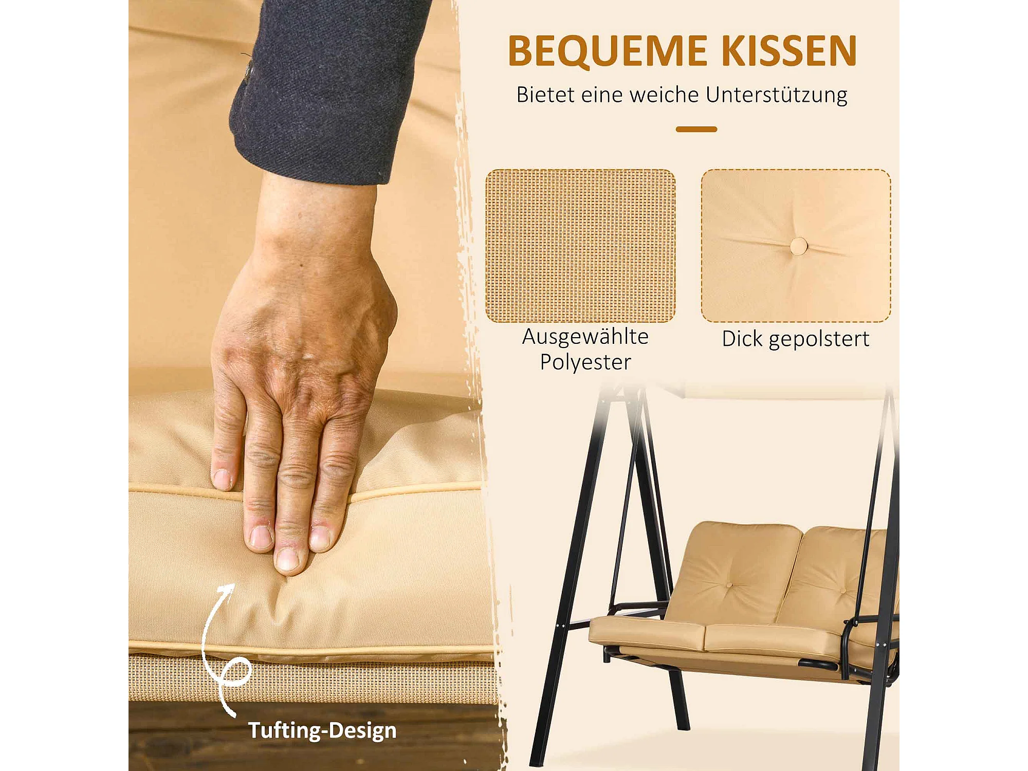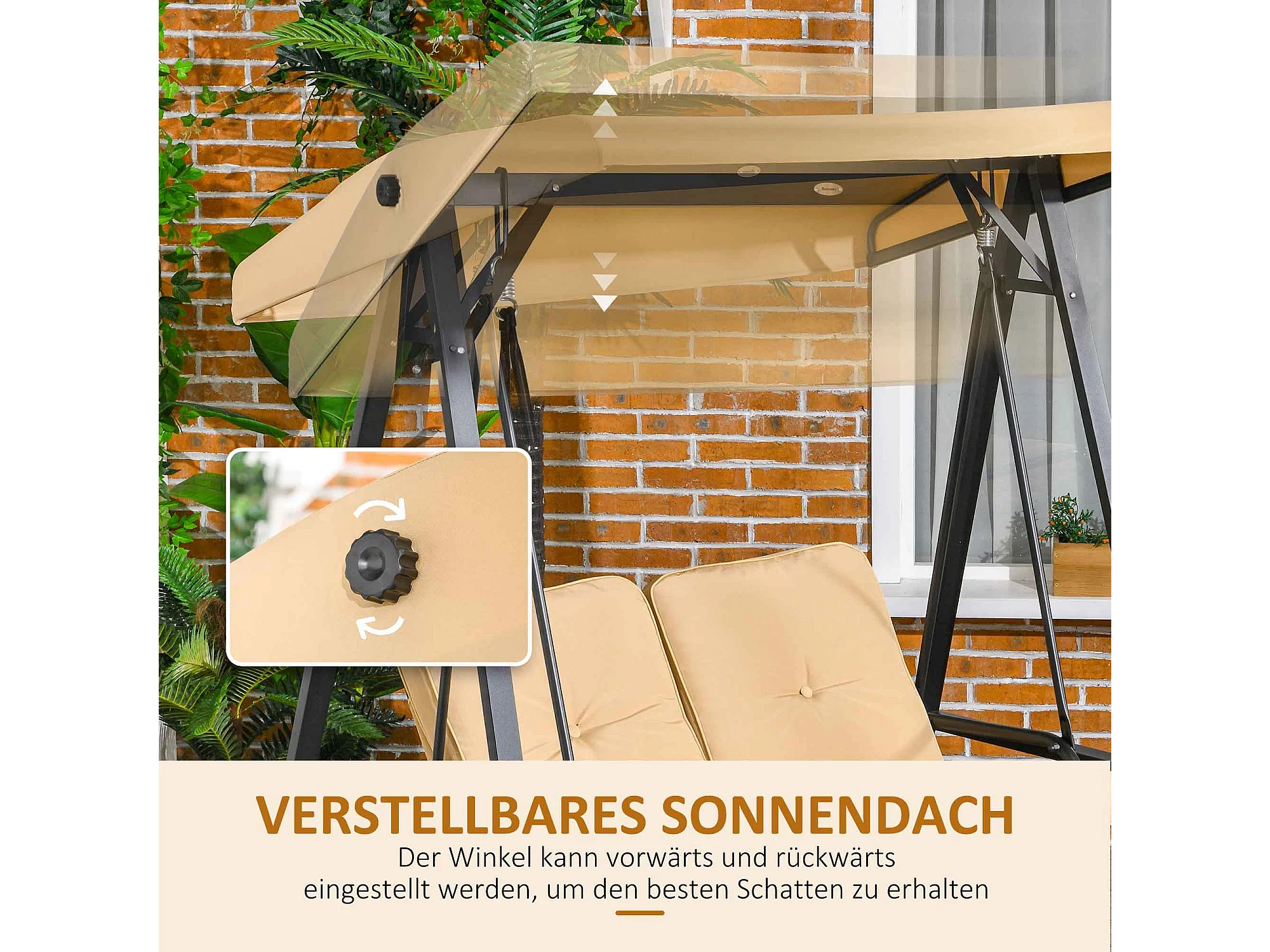 Altalena da giardino a 3 posti con tetto regolabile, struttura in acciaio, beige (138x106x174 cm)