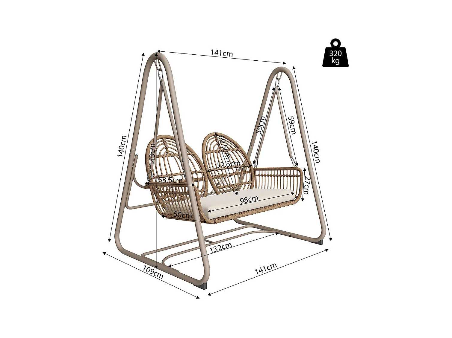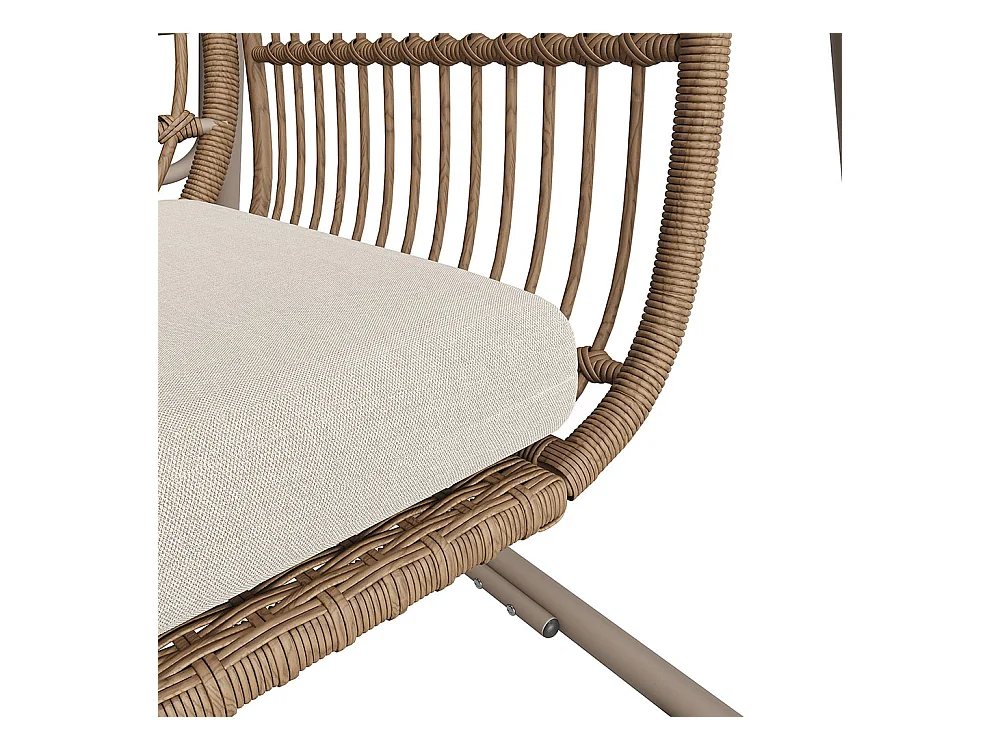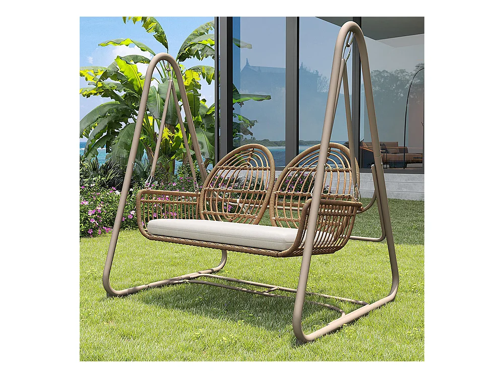 Altalena da giardino con schienale, set di mobili da giardino, rattan PE, 2 posti, telaio marrone e cuscini beige