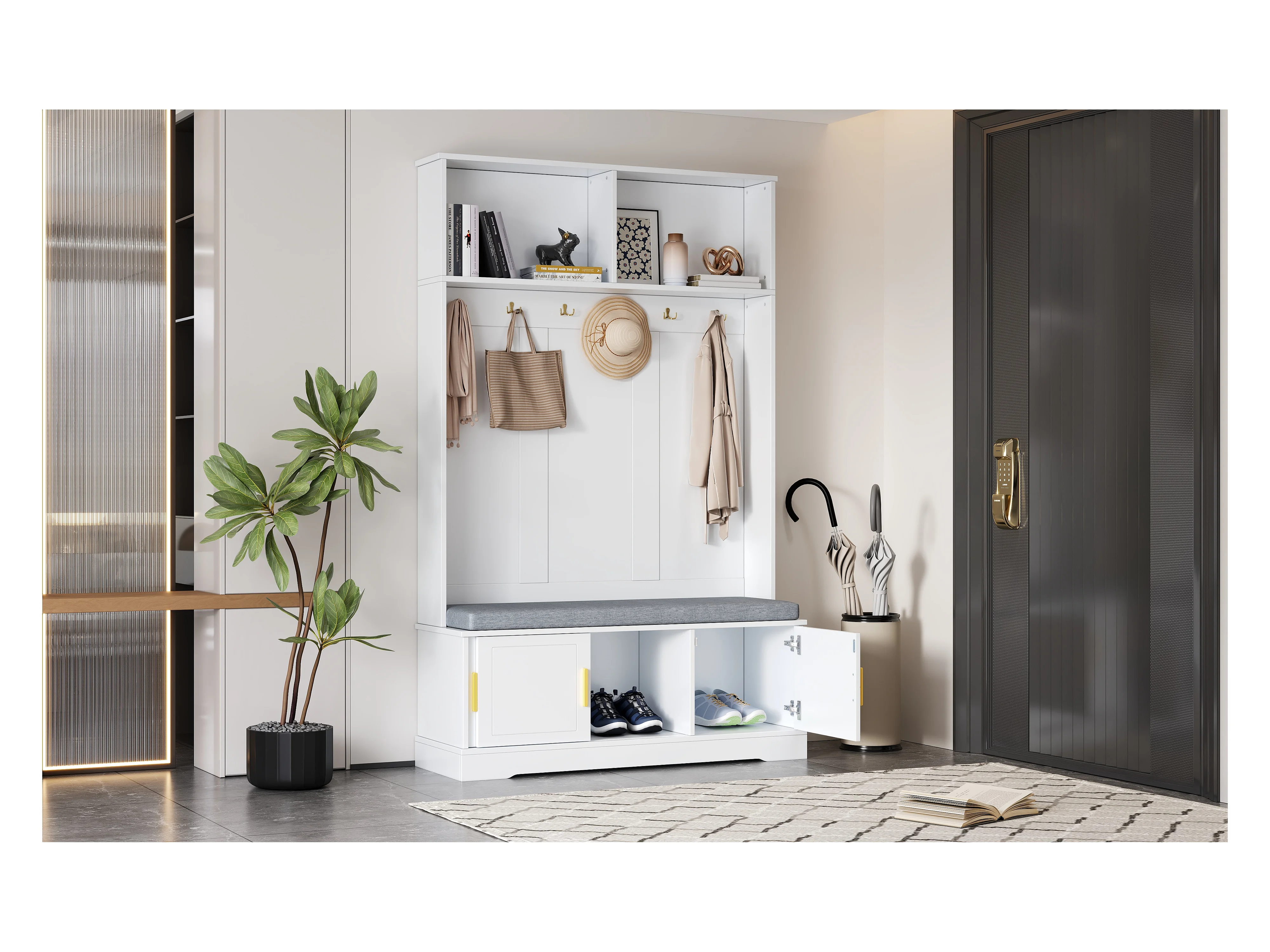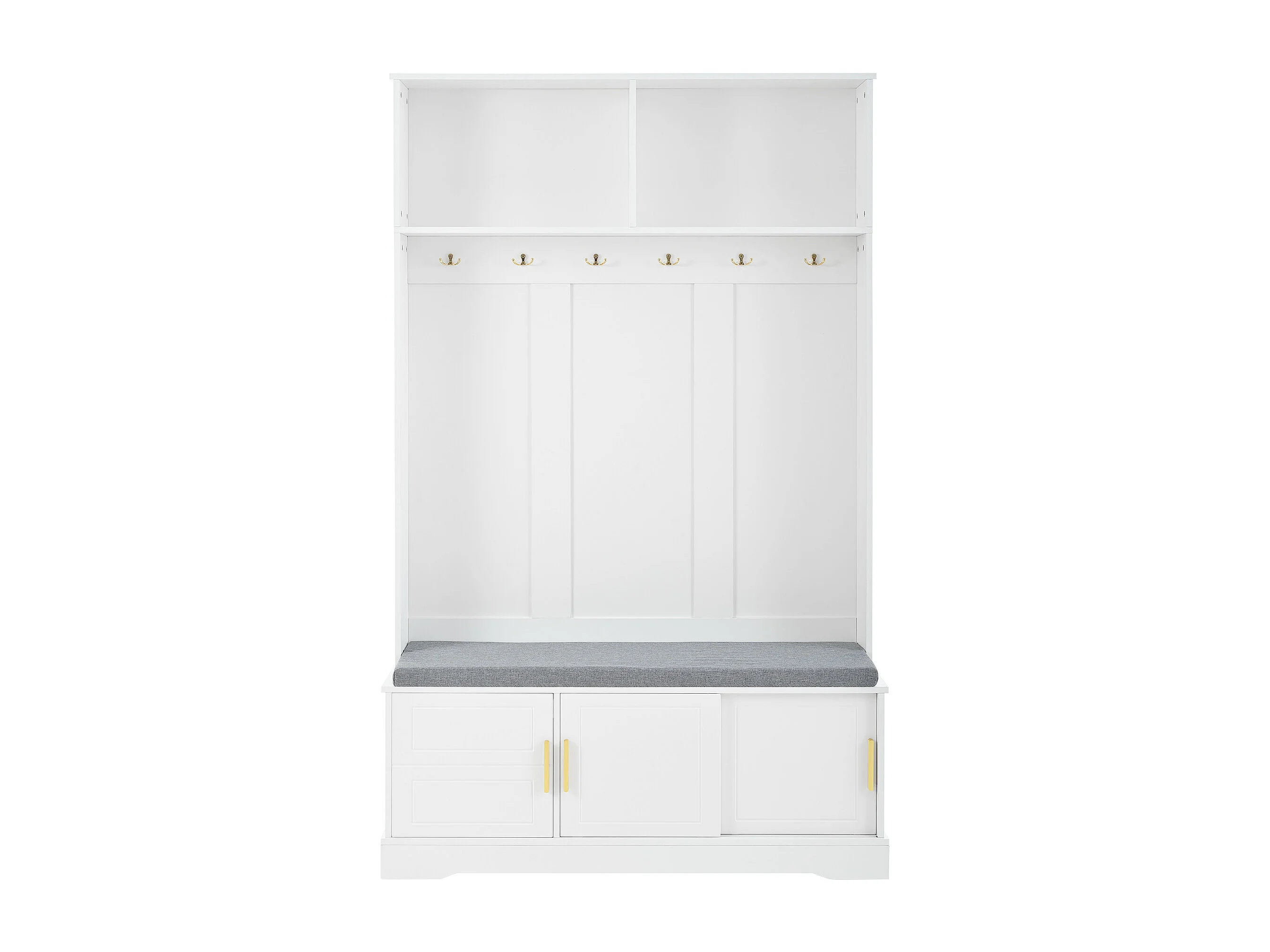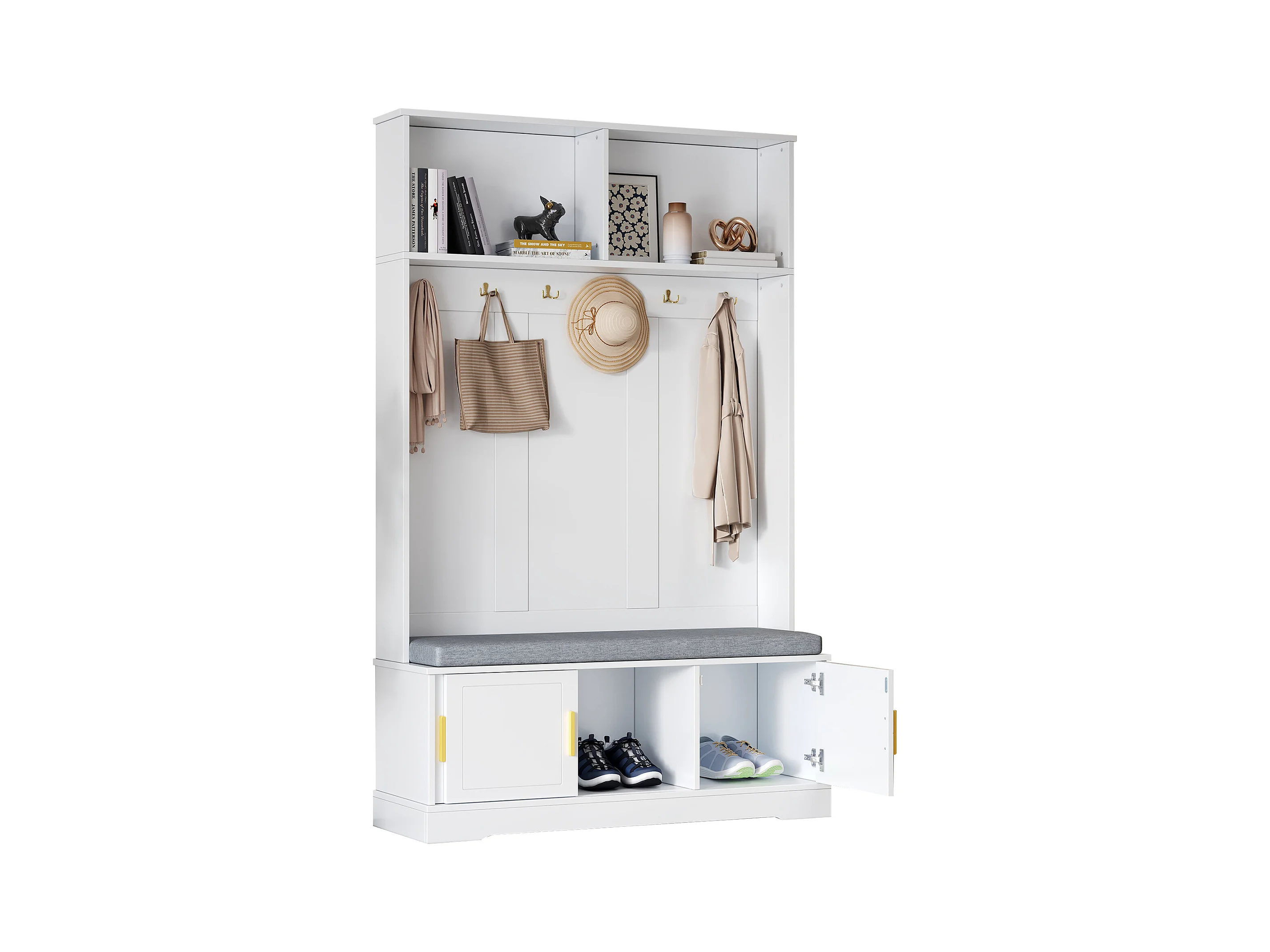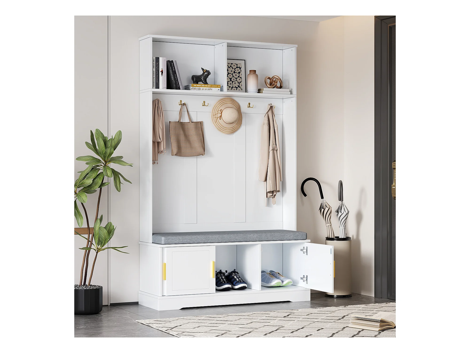 Appendiabiti con panca portascarpe, 6 ganci tripli, design moderno, truciolato, bianco (120x40x191 cm)
