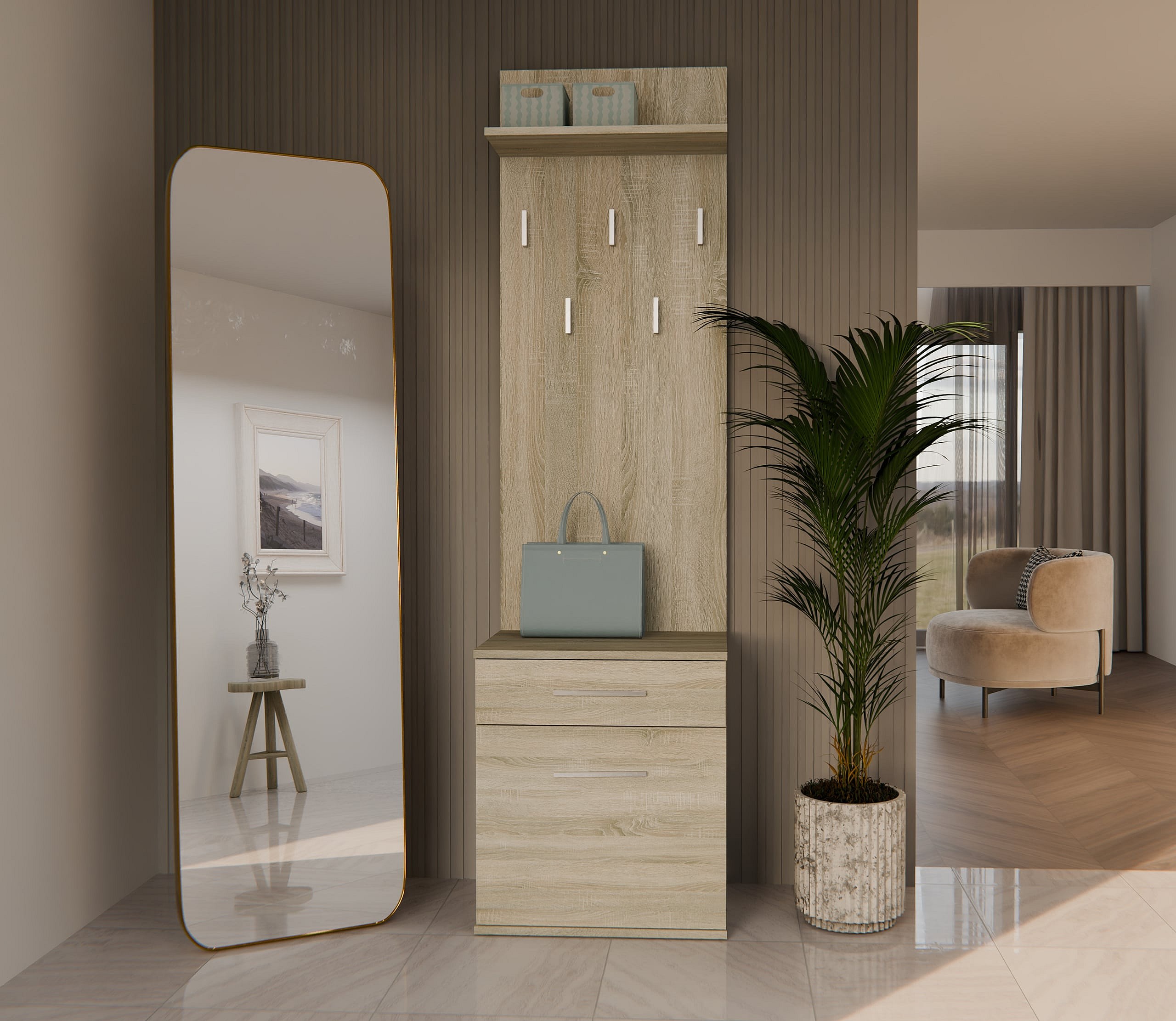 Appendiabiti a parete di design con 4 ganci e armadio in rovere chiaro Mista