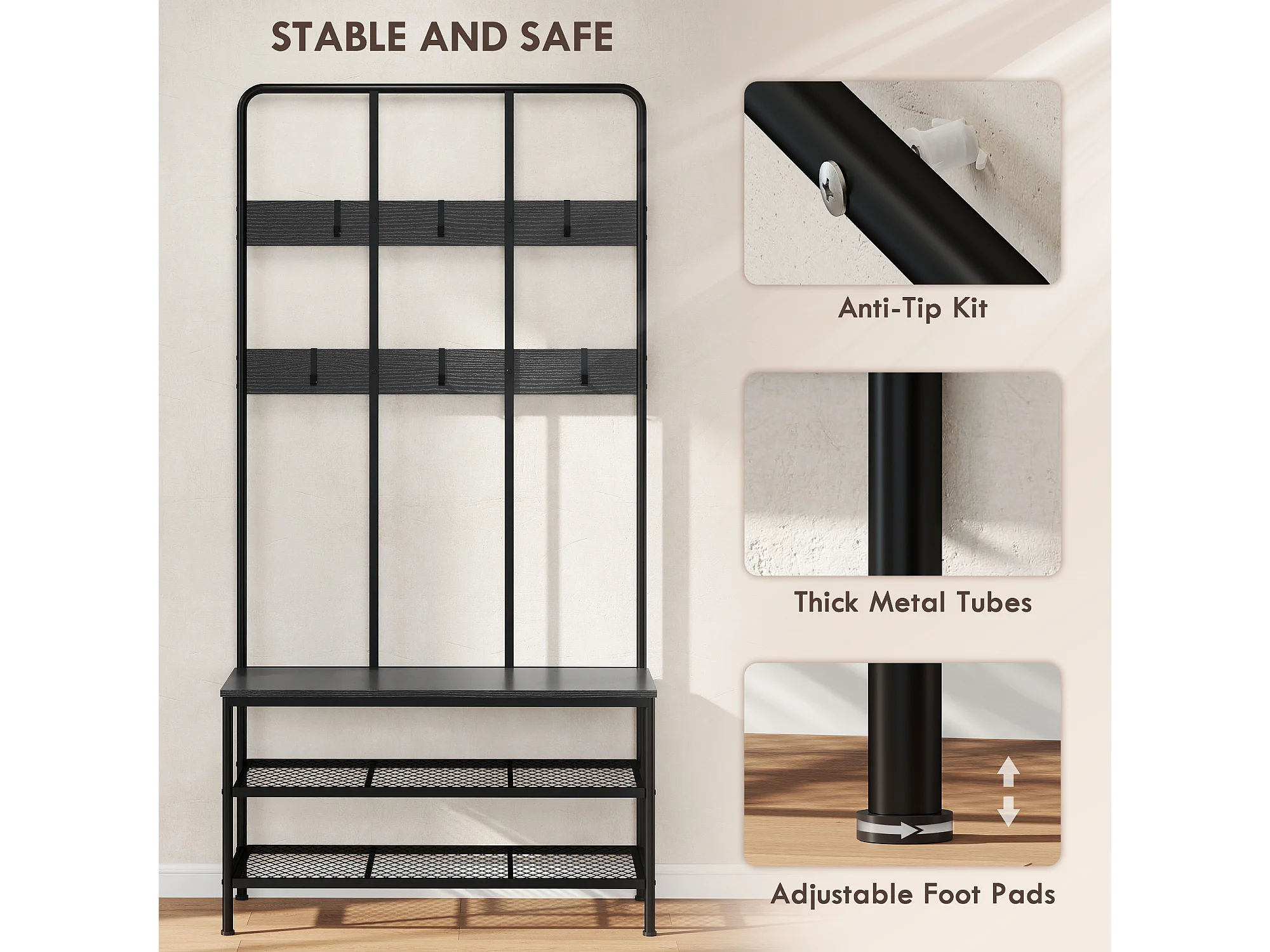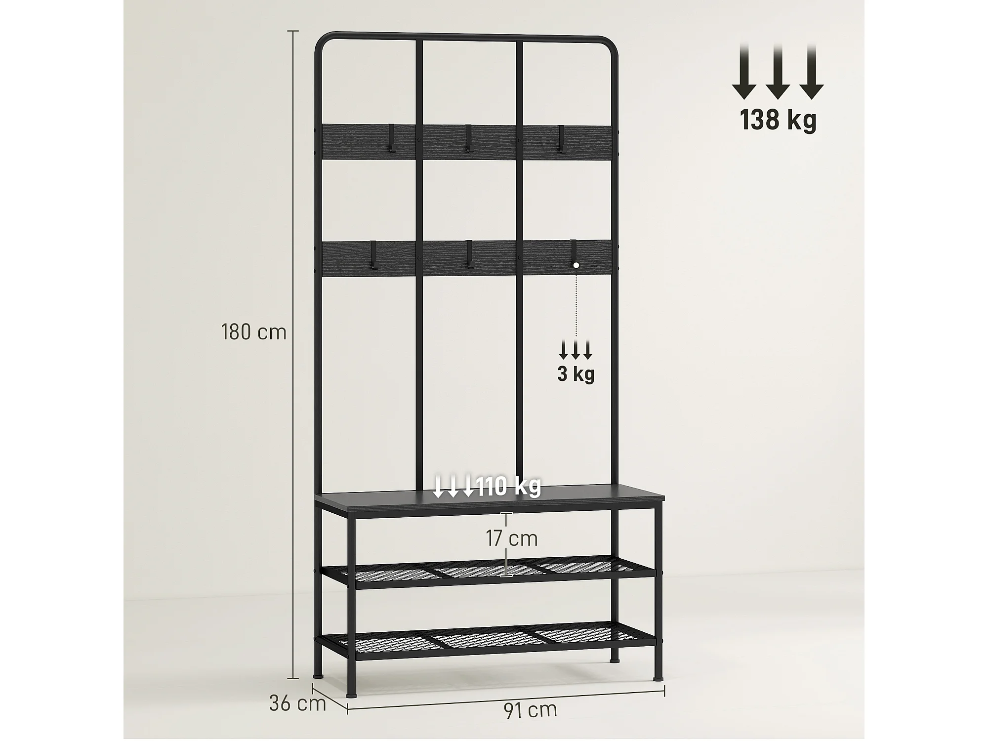 Appendiabiti da terra con 3 ganci barra e ripiano inferiore nero